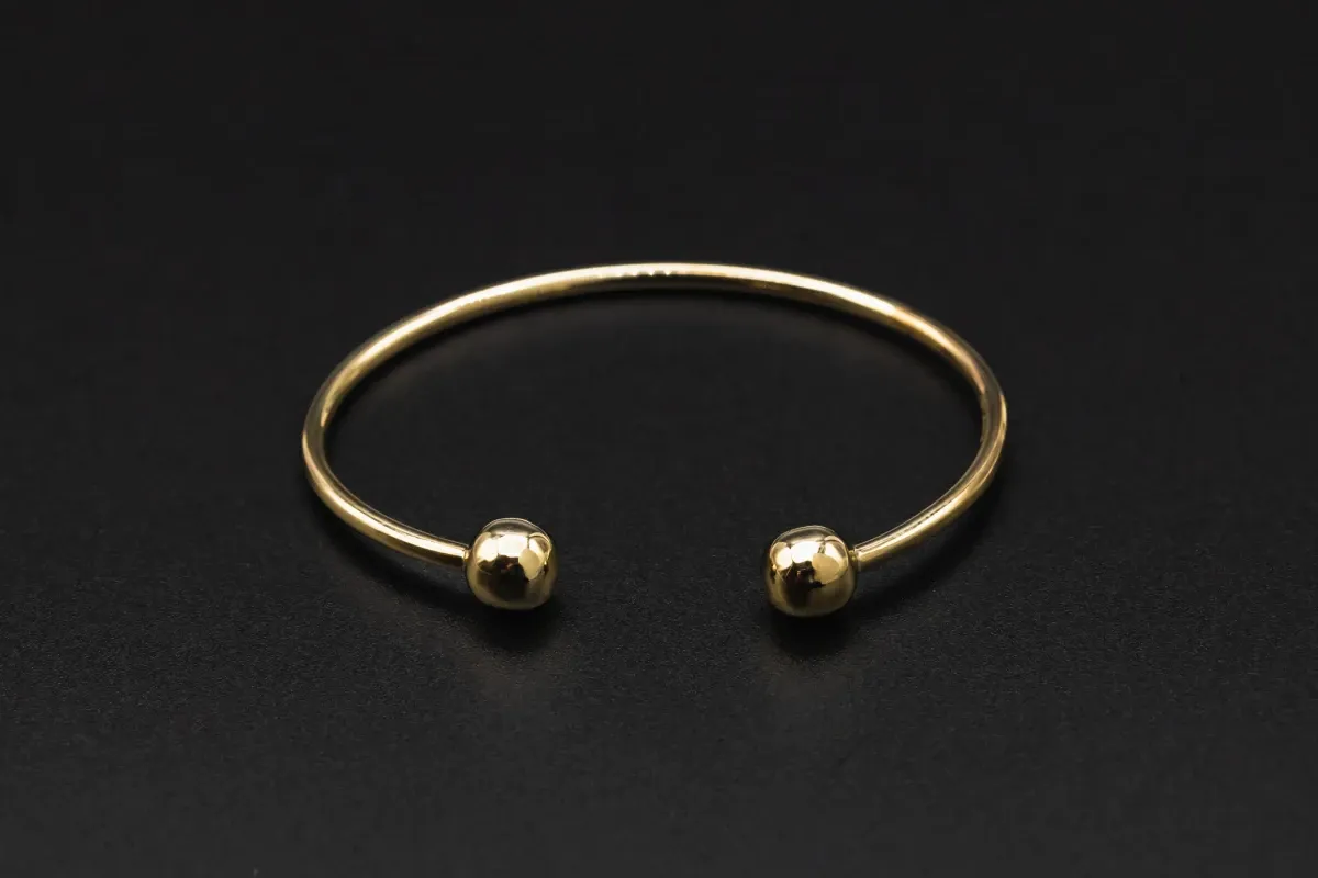 The 9ct Yellow Gold Baby Torque Bangle, weighing 2g, features a sleek and minimalist design.