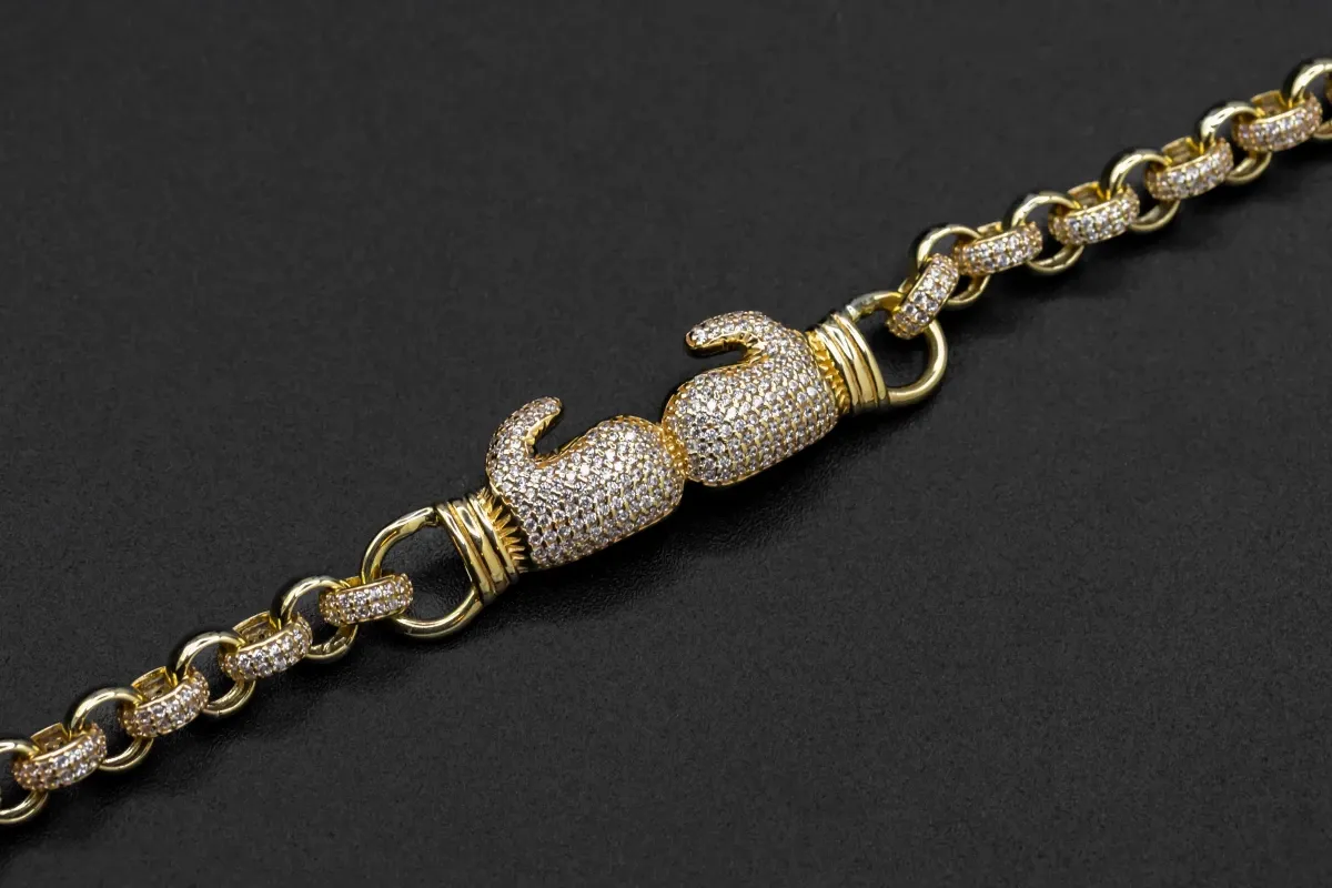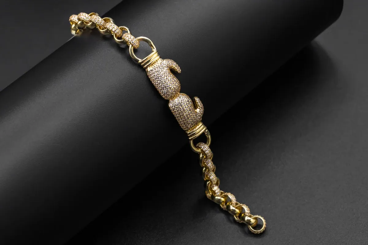 Introducing our 9ct Yellow Gold Belcher Bracelet with CZs and Boxing Gloves, a distinctive 6.75-inch piece that combines elegance with a sporty twist.