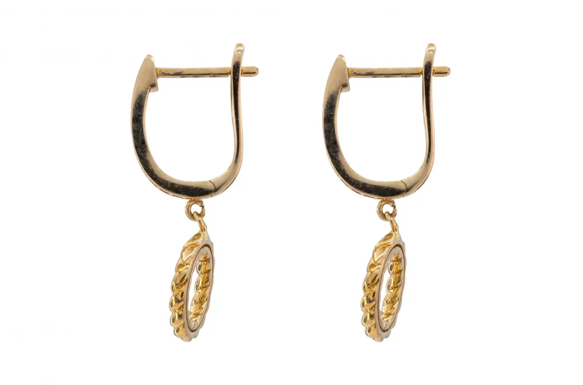 Featuring a secure hinged fastening with a snap closure. A full British hallmark is located on fastening wires which confirms the gold purity.
