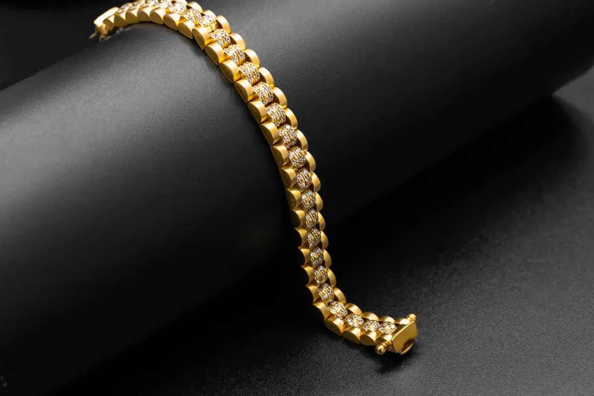 The Presidential style bracelet features a series of sparkling Cubic Zirconia (CZ) stones, meticulously set to add a touch of glamour and brilliance to the piece.