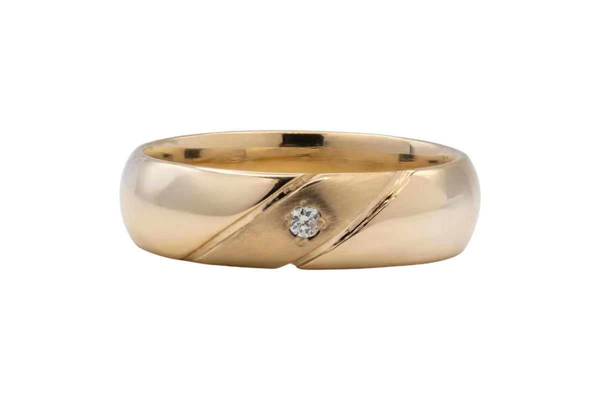 This 9ct yellow gold ring features a 0.03ct diamond at its center, offering a timeless and elegant design.