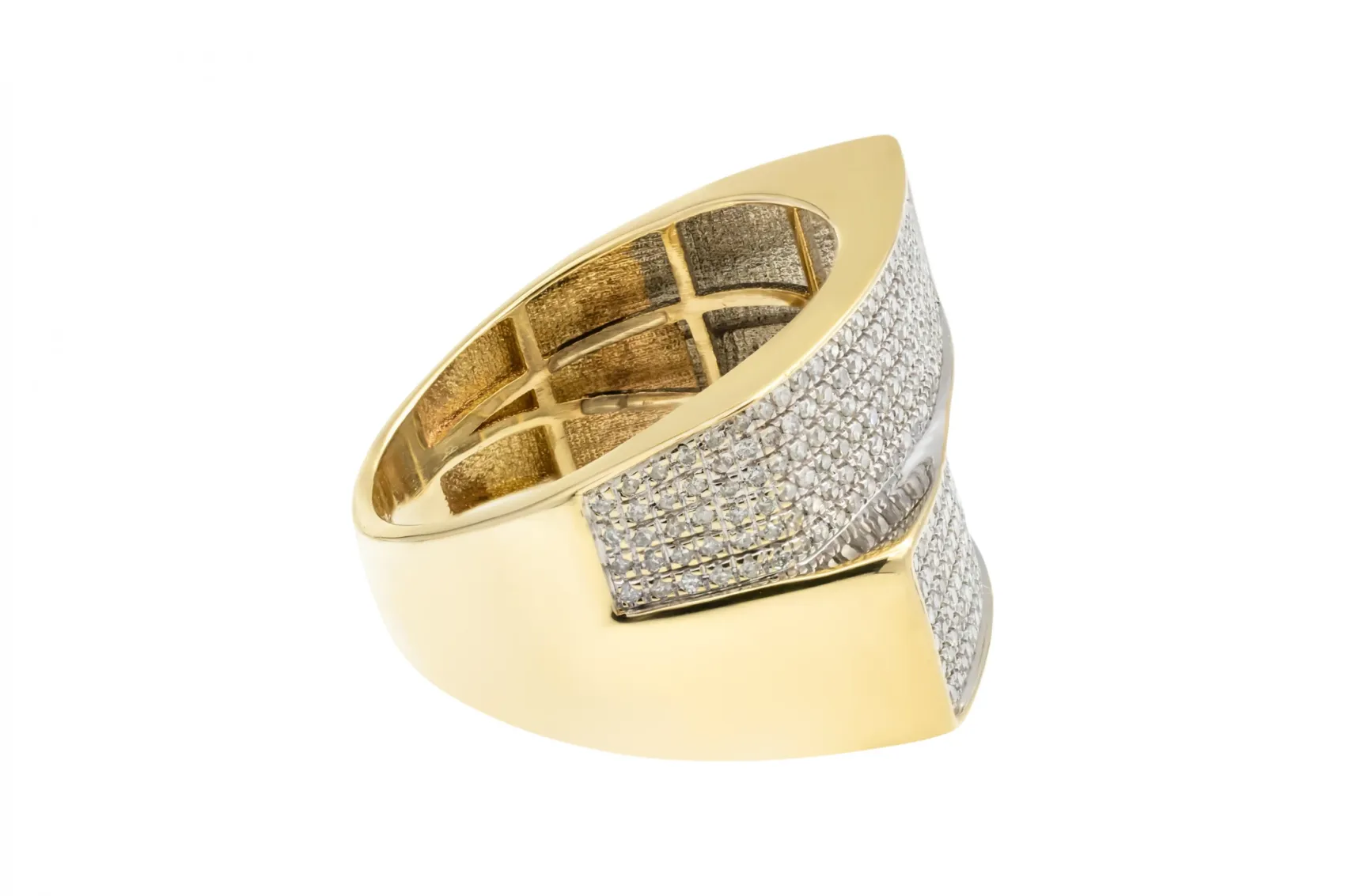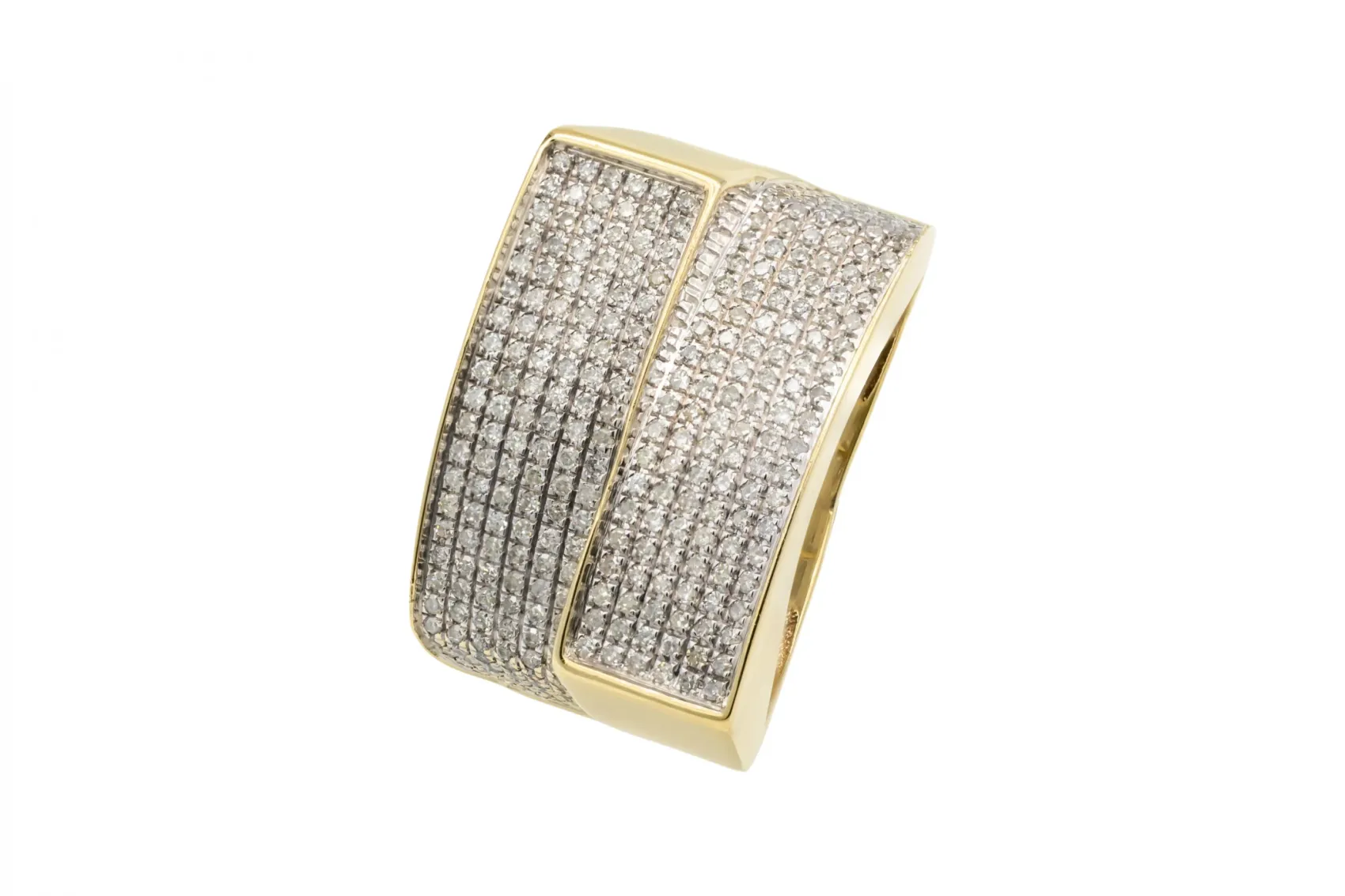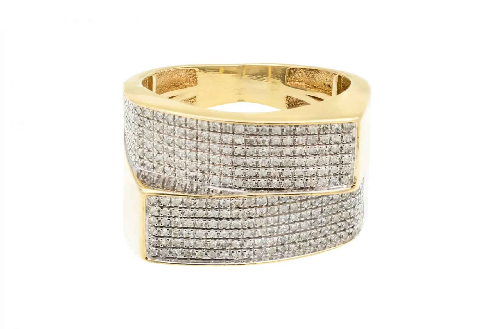 A striking 9ct yellow gold micro pave diamond ring featuring dazzling round brilliant diamonds totaling 0.70 carats.