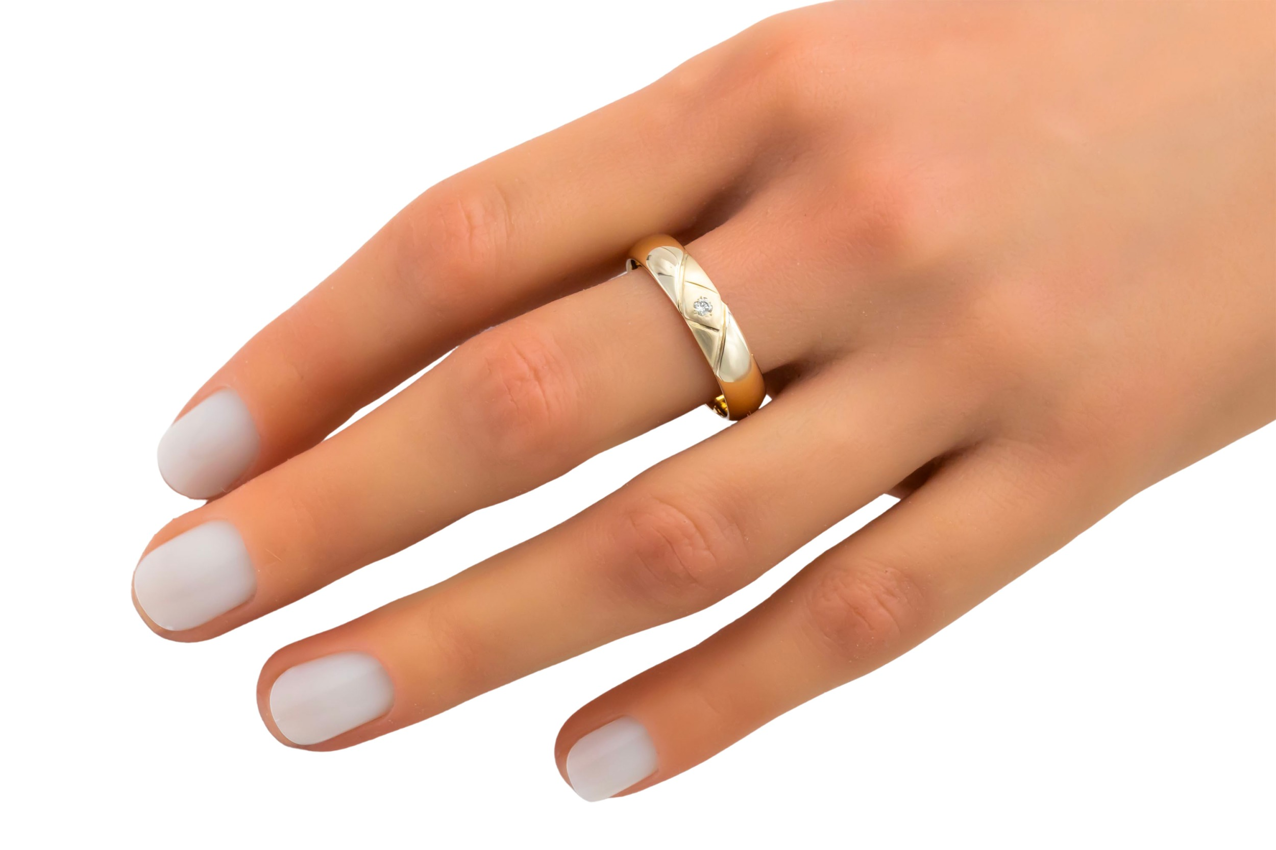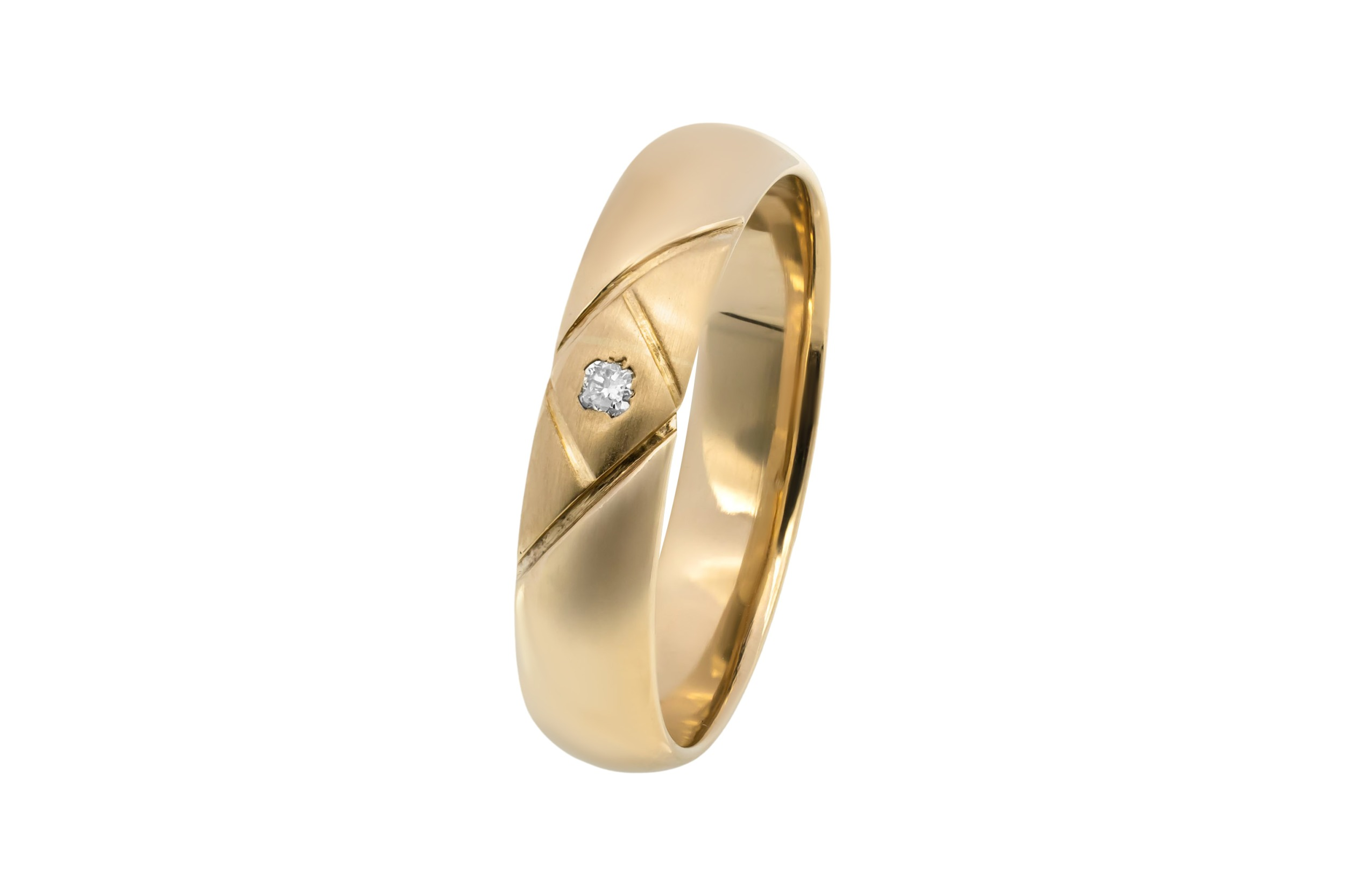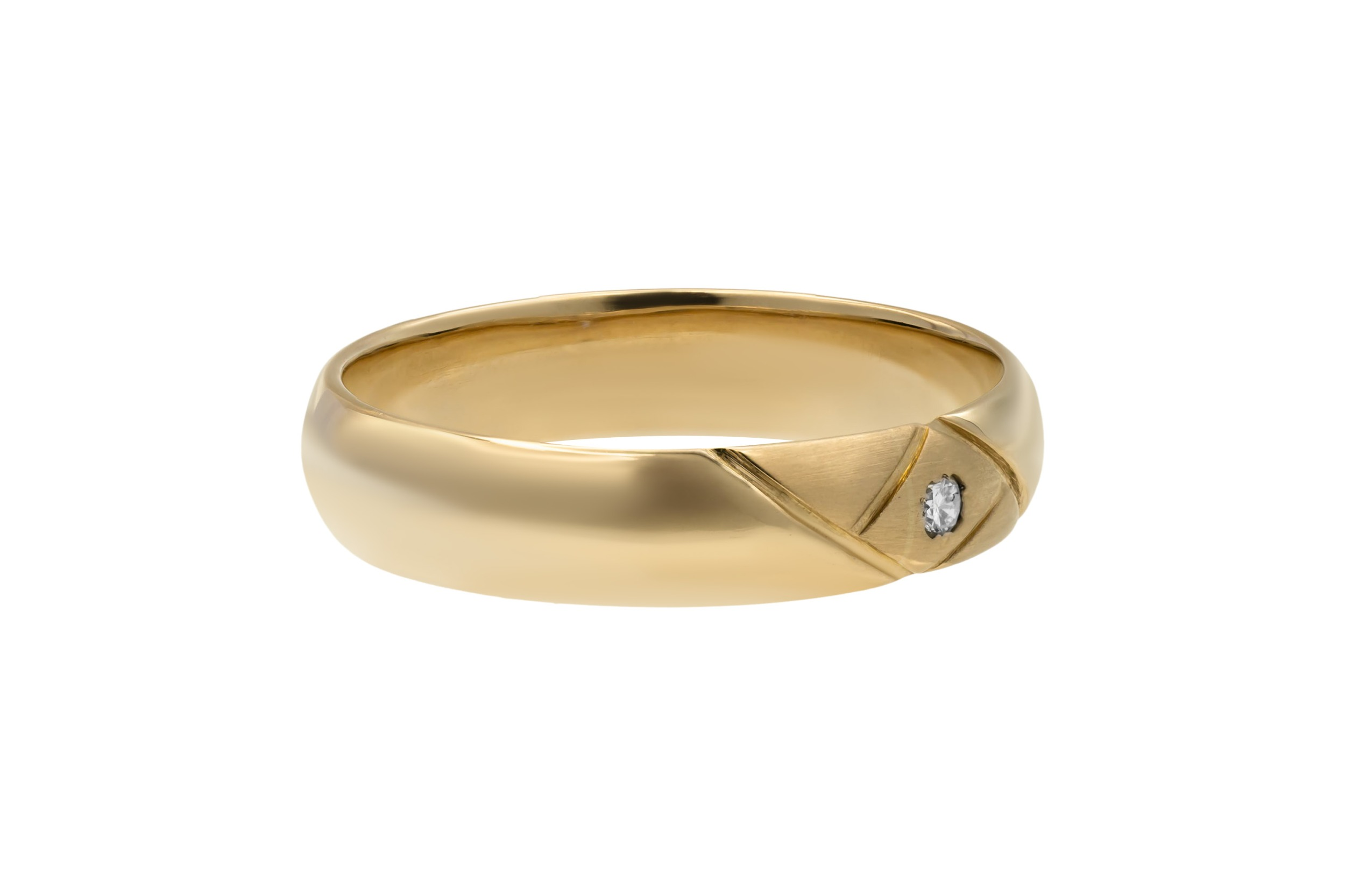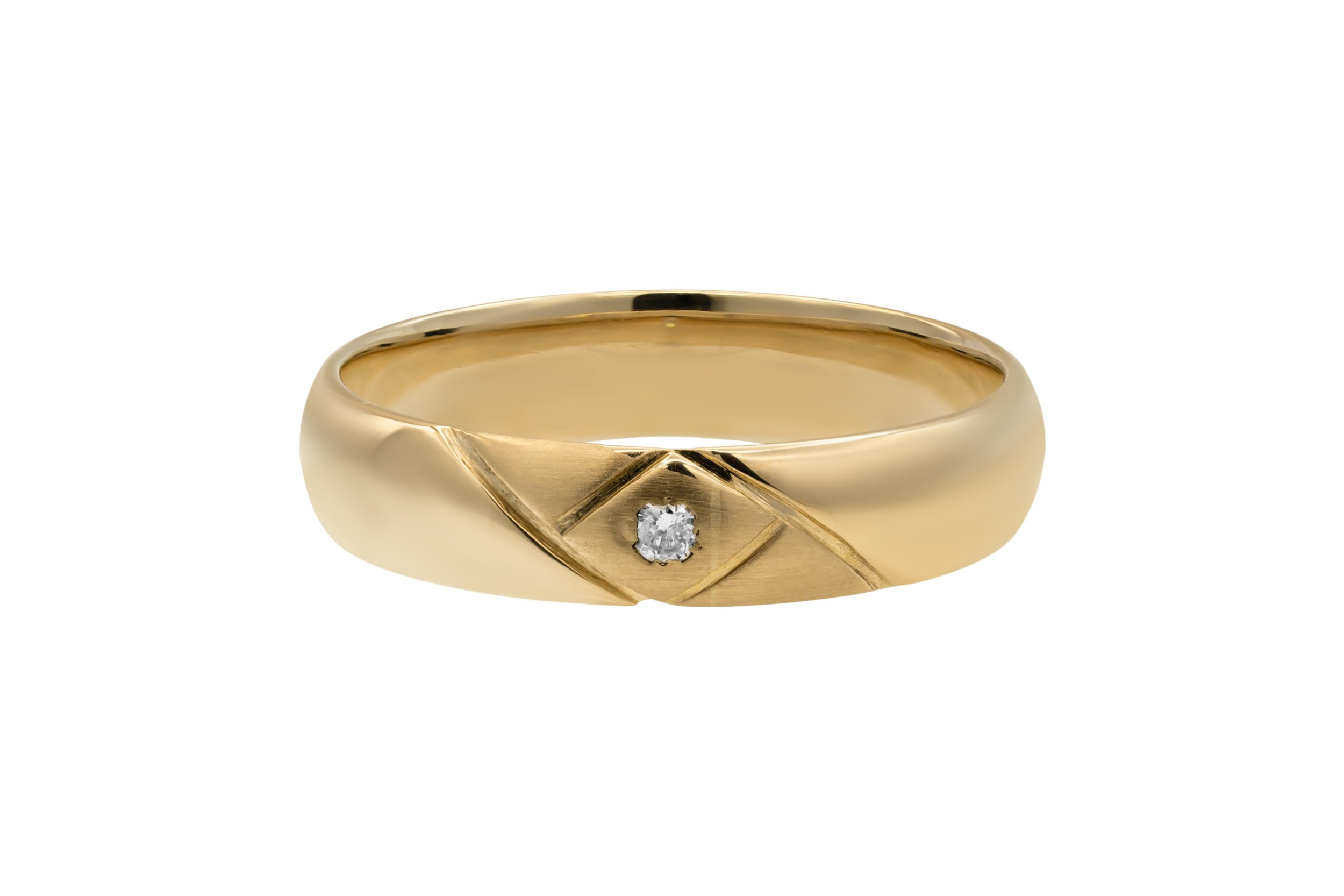 Crafted in 9ct yellow gold, this classic band ring features a subtle 0.05ct diamond set at its centre for understated elegance.