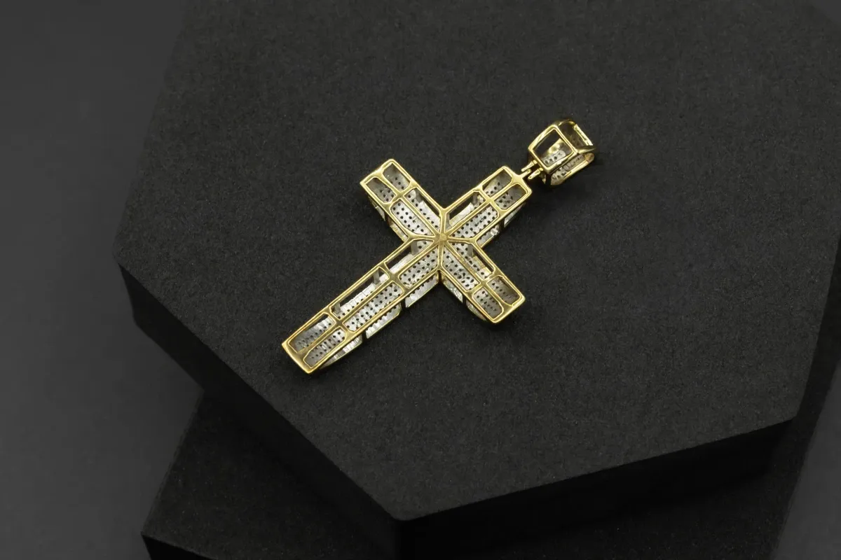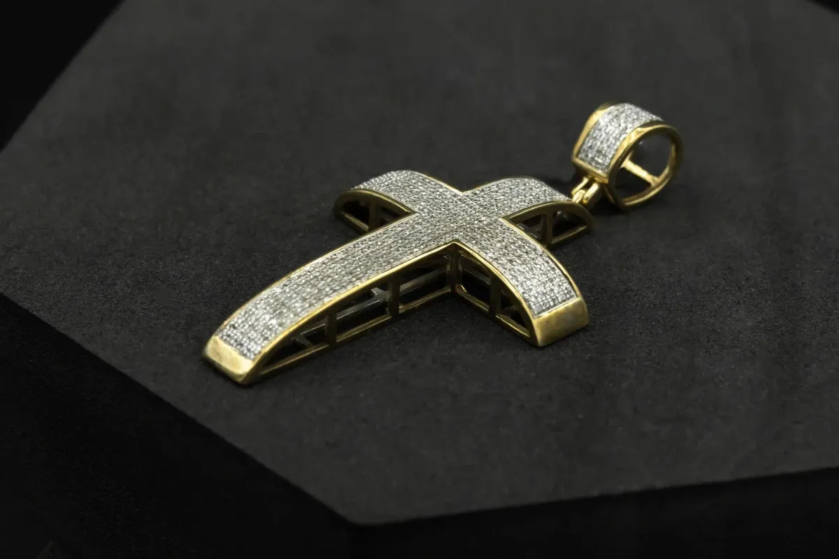 The pendant features a classic cross shape, symbolizing spirituality and devotion. Adding a touch of sparkle and brilliance, the cross is embellished with diamonds.