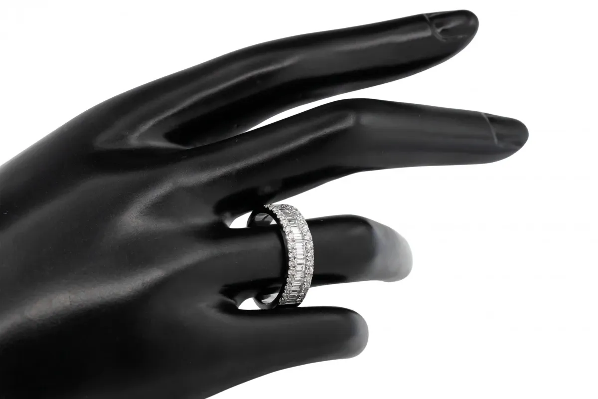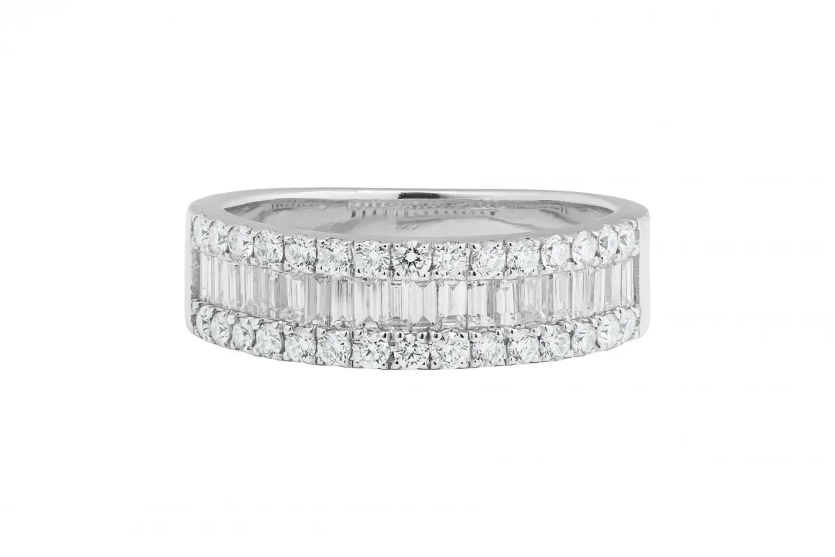This striking eternity ring is crafted in 9ct white gold and set with 1.15ct of G VS quality baguette-cut diamonds, offering a clean and contemporary sparkle all around the band.