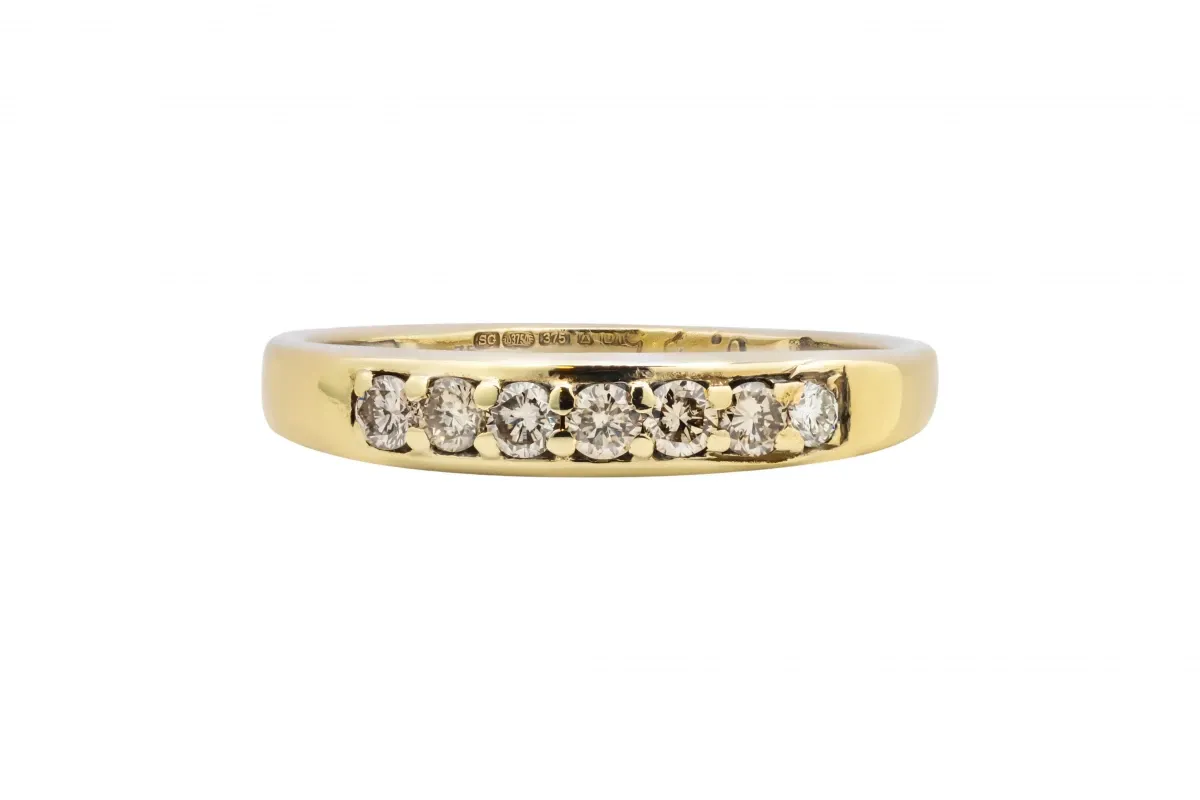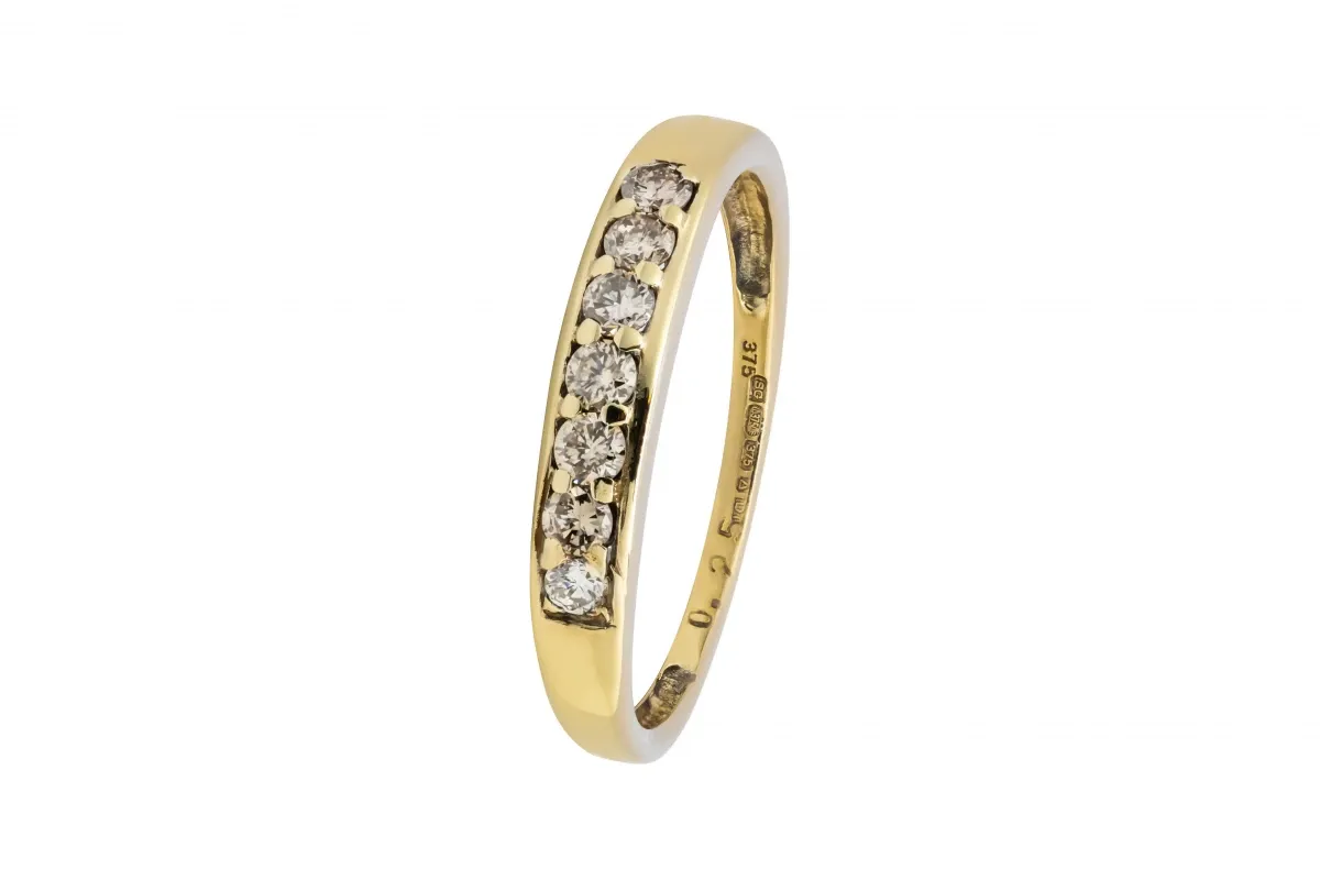 Crafted in 9ct yellow gold, this elegant wedding band features seven claw-set diamonds, totalling 0.25ct.