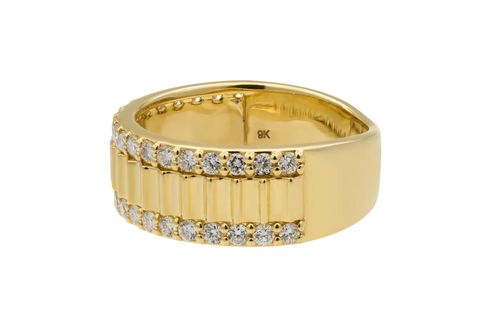This bold 9ct yellow gold band features a double row design set with 0.91ct of natural round brilliant cut diamonds, offering strong sparkle and presence.