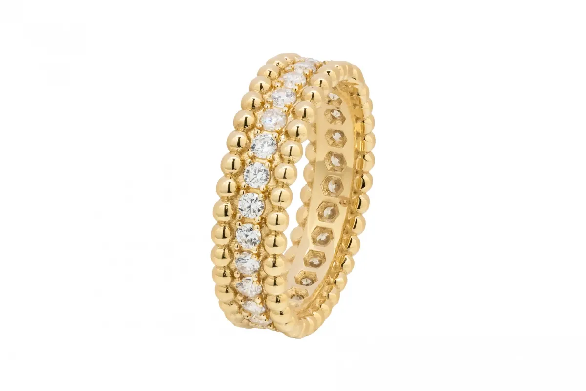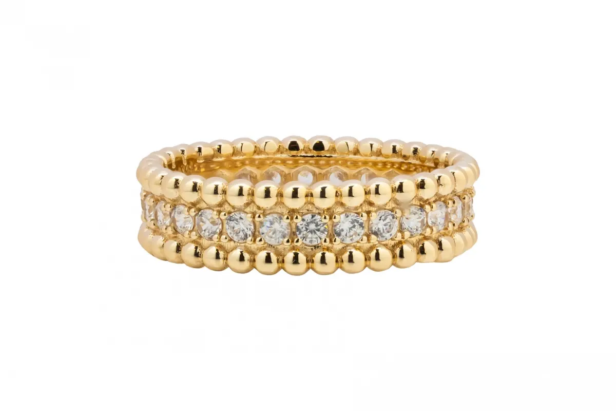 This elegant 9ct yellow gold band features a double row of cubic zirconia stones, enhanced by intricate milgrain detailing for a vintage-inspired touch.