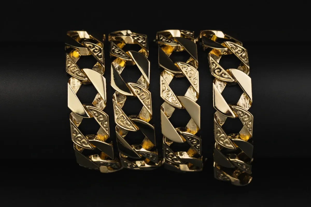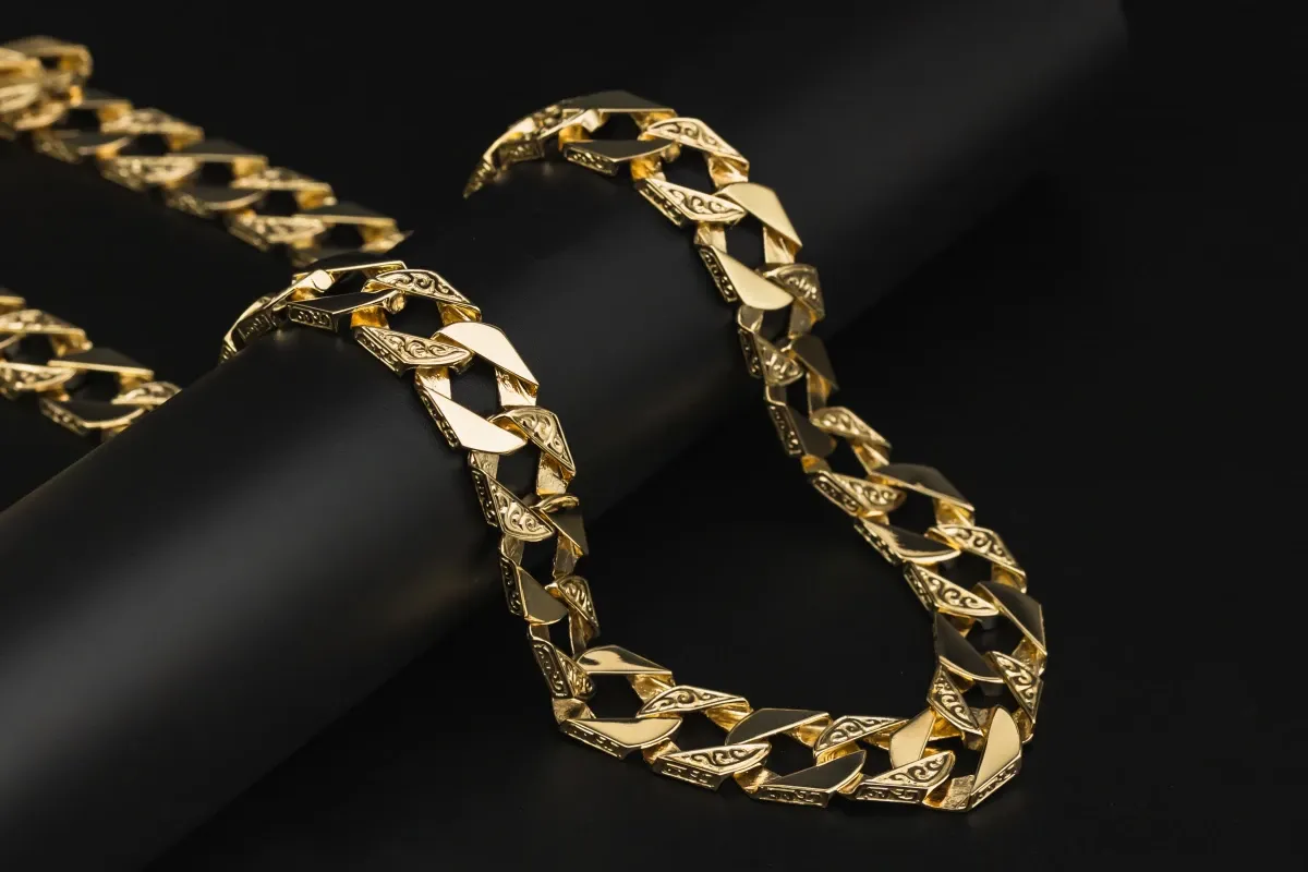 Crafted in solid 9ct yellow gold, this 28" bombe chain is a standout statement piece. Weighing an impressive 144 grams, it features a bold 16mm width that adds substance and presence to any look.