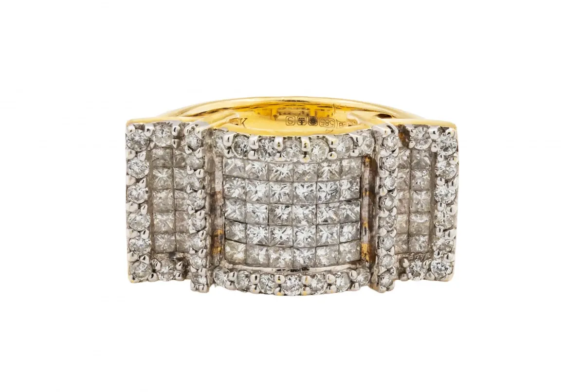 An impressive 9ct yellow gold diamond cluster ring boasting both round brilliant and invisable set pricess cut diamonds.
