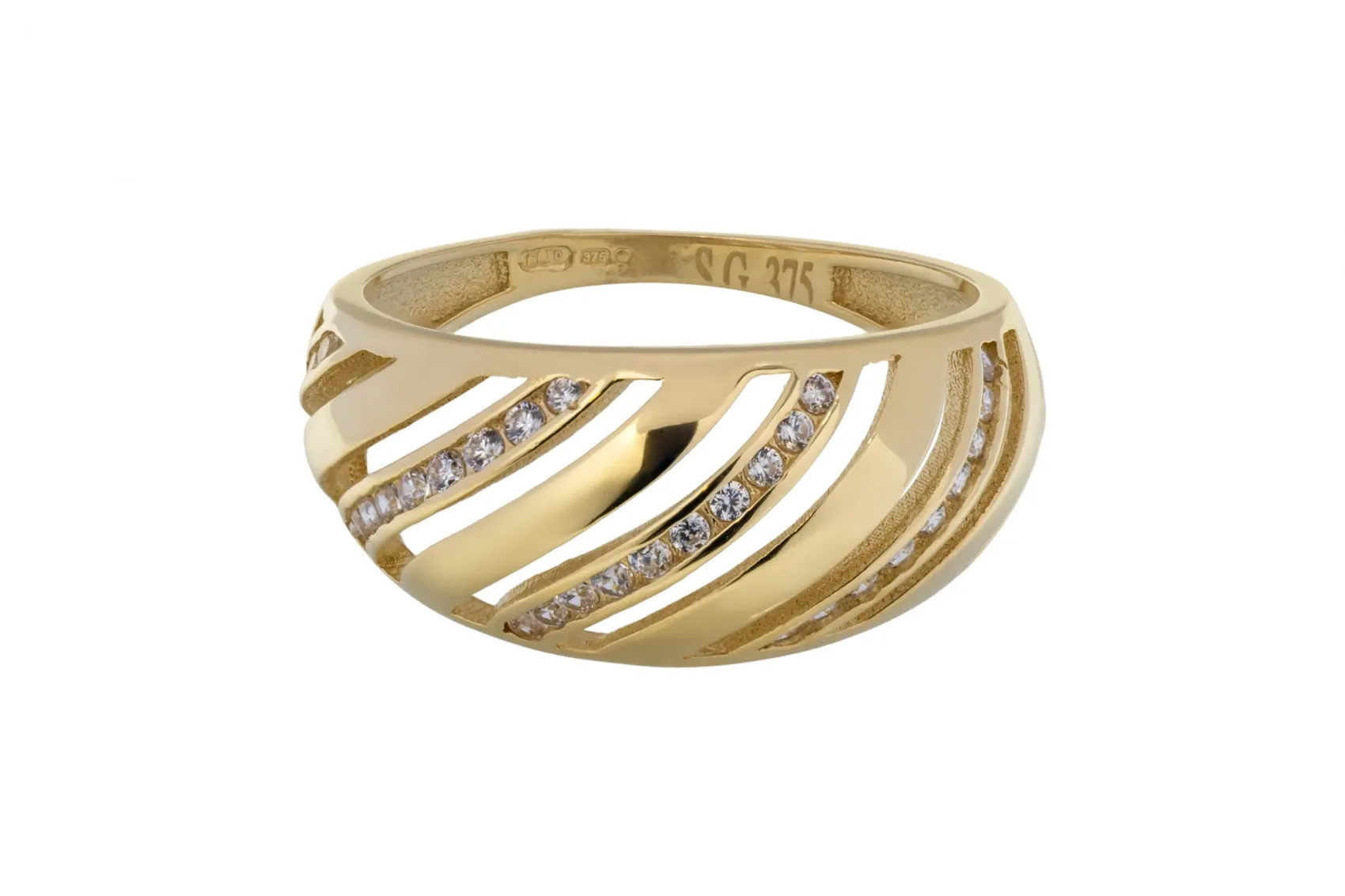 This stylish 9ct yellow gold ring features a flowing wave design set with sparkling cubic zirconia stones that mirror the brilliance of diamonds.