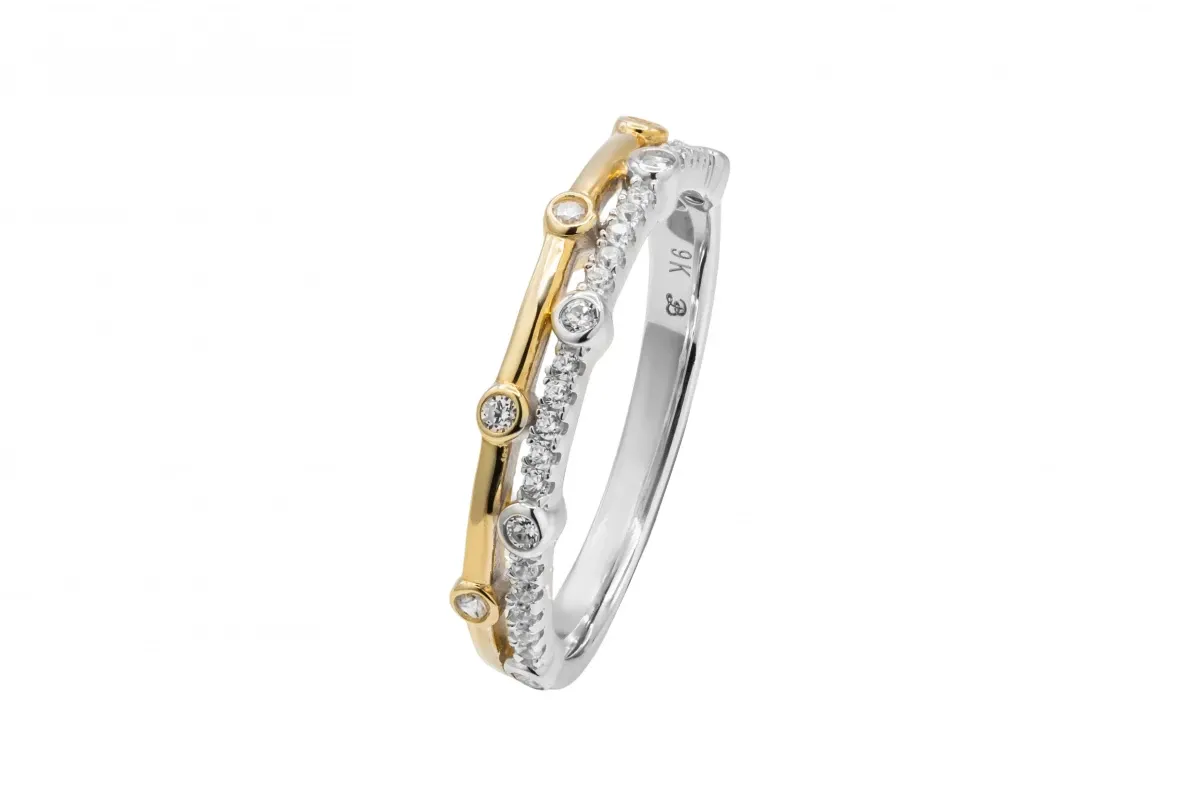This elegant two-tone 9ct yellow and white gold ring features sparkling cubic zirconia stones for a touch of brilliance.