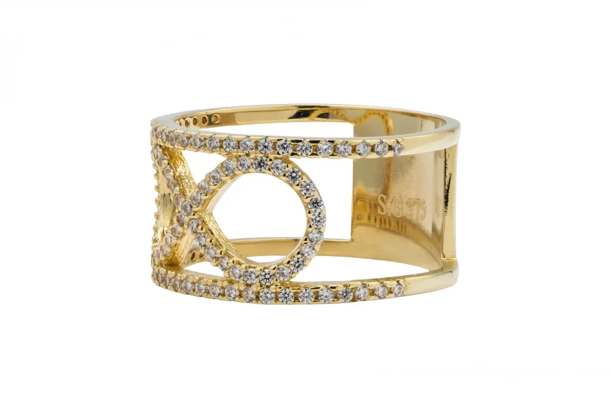 This stylish 9ct yellow gold ring features a unique zigzag design adorned with sparkling cubic zirconia stones.