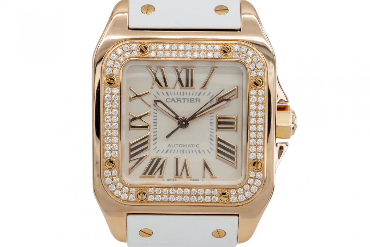This 2010 Cartier Santos 100 features a 33mm white roman numeral dial and a white Cartier rubber strap with a 18ct rose gold buckle. It also features an 18ct rose gold factory diamond bezel secured with 8 screws.
