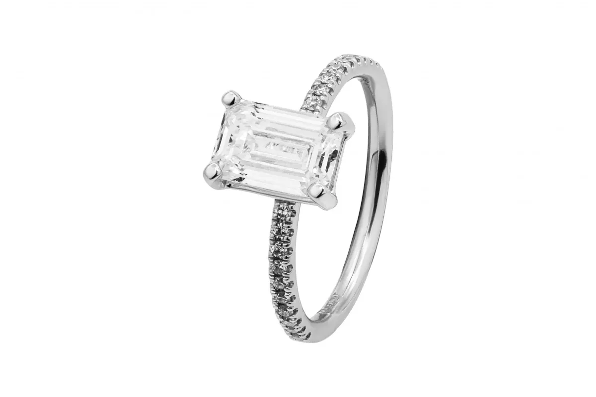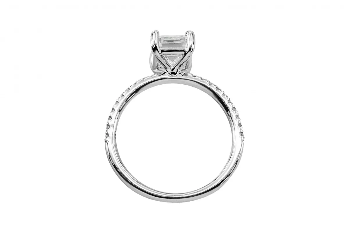 This gorgeous diamond engagement ring is set with 1.47ct Above Earth emerald cut lab grown diamonds in E/VVS2 quality. Size