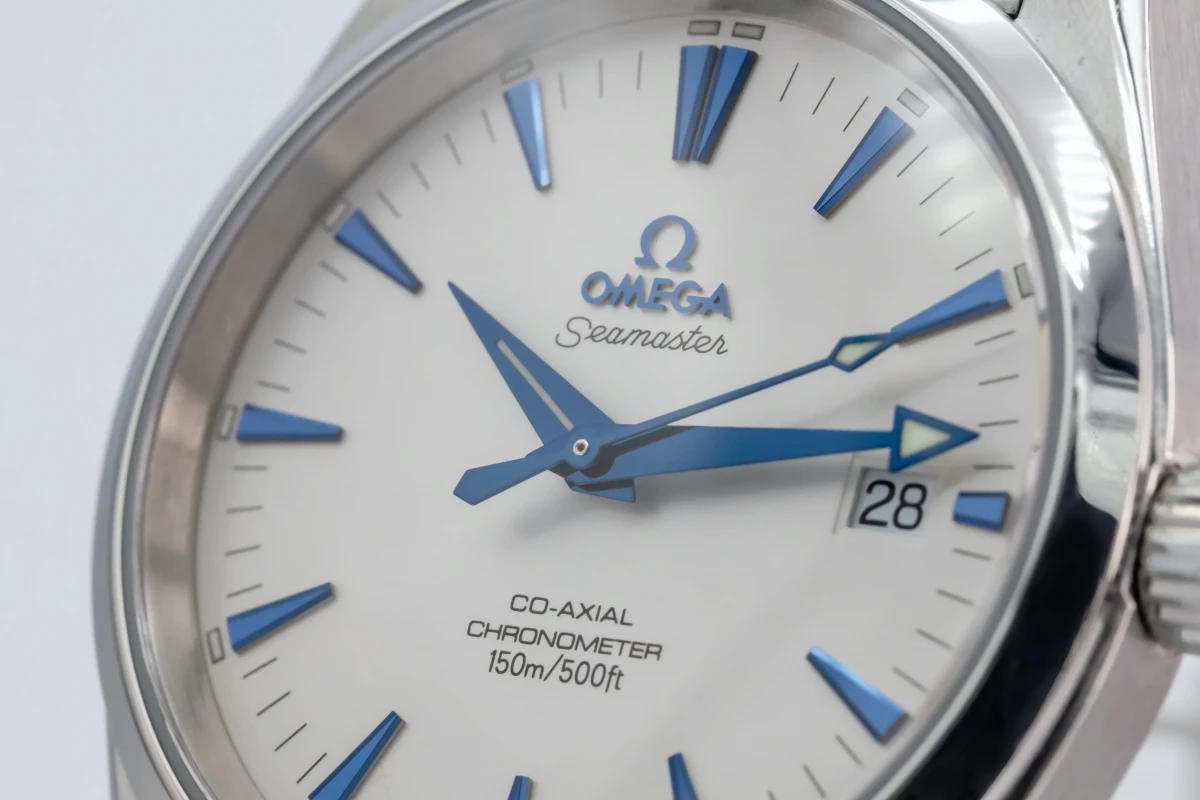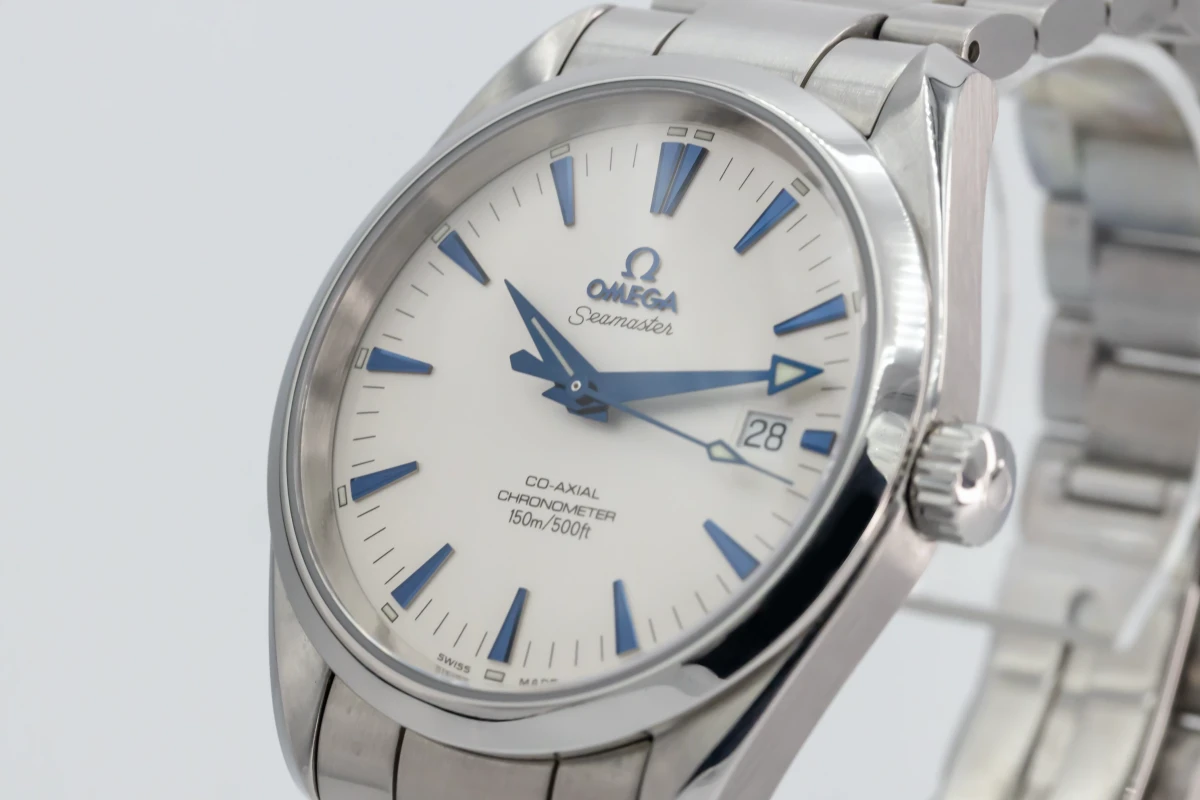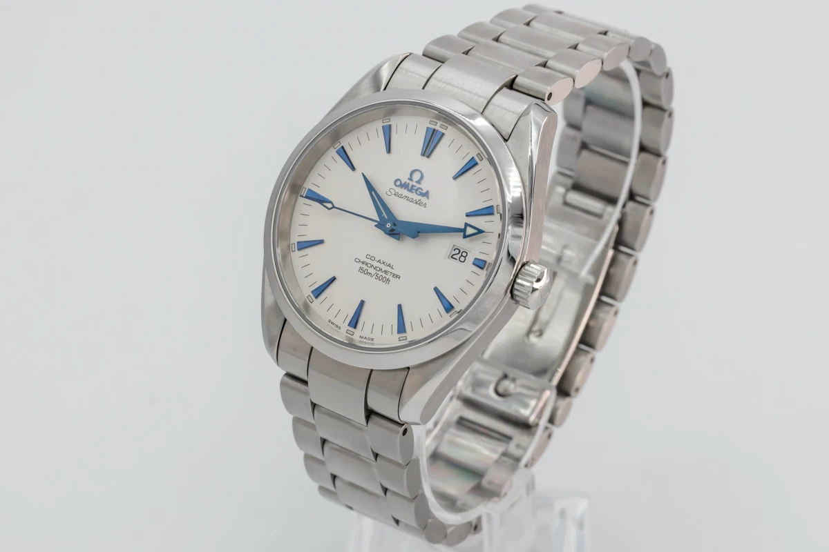 This 2008 Omega Seamaster Co-Axial Chronometer features a 39mm white dial with the date at 3 o'clock and blue hands and indexes. It is presented with a stainless steel polished and brushed bracelet with a smooth stainless steel bezel.