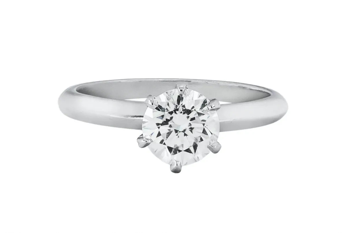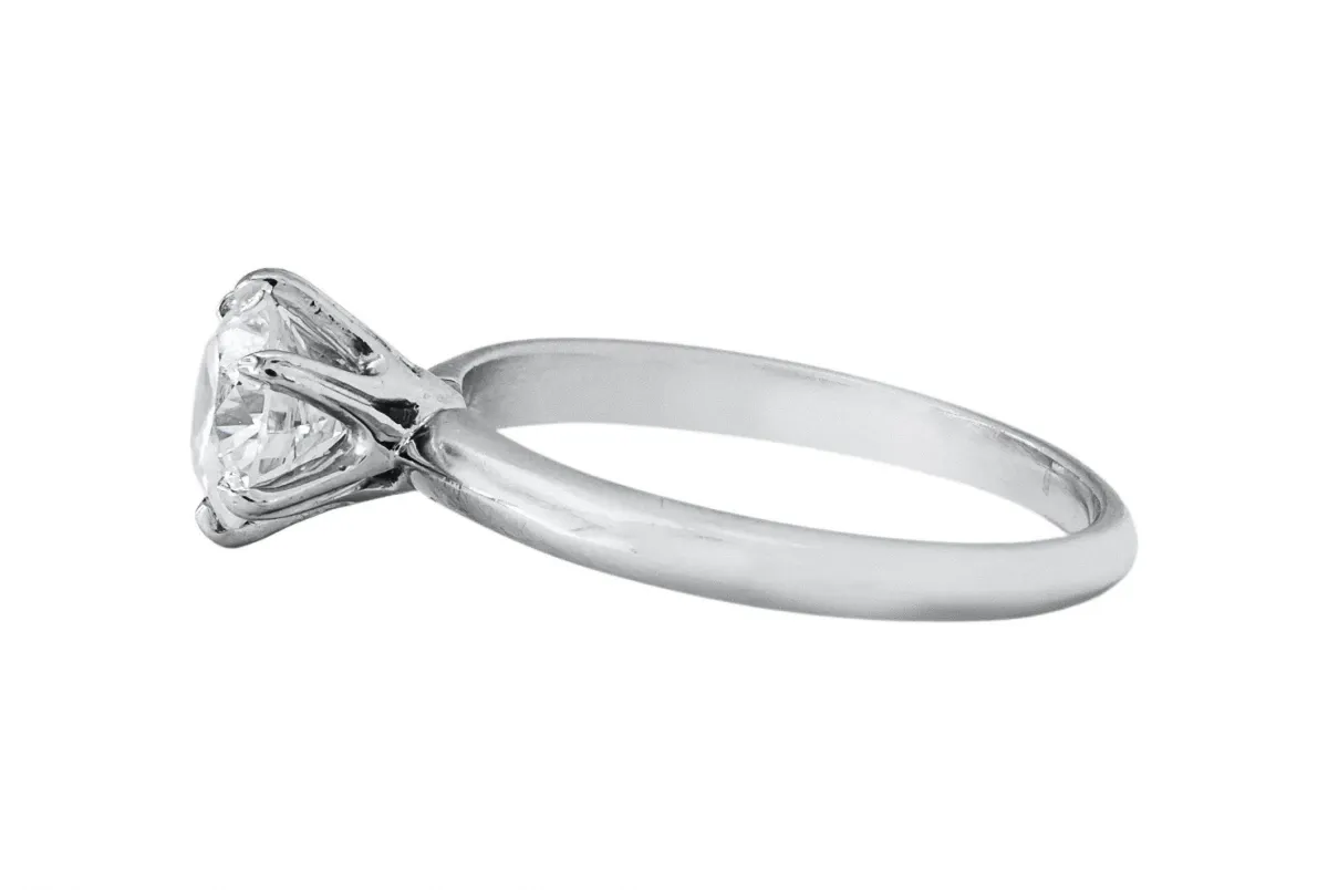 A platinum 6 claw round brilliant diamond engagement ring that features a cut solitaire diamond.
