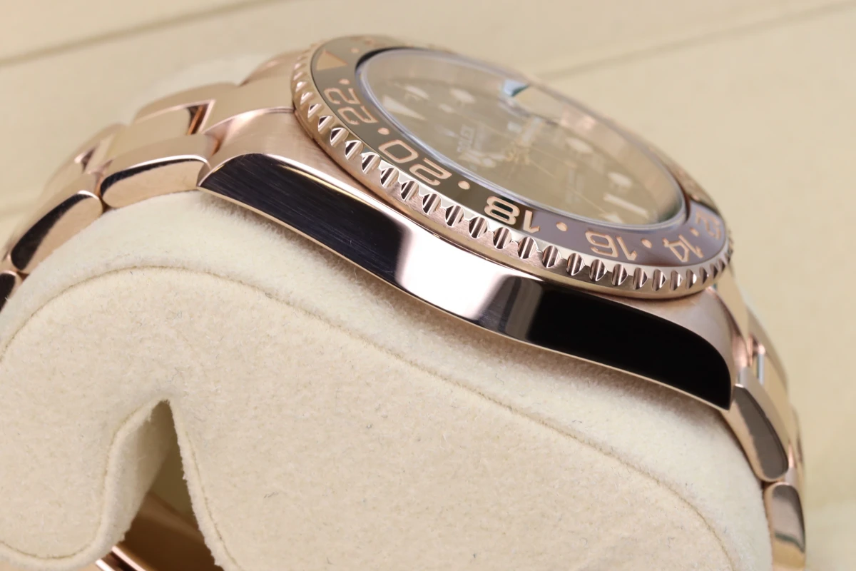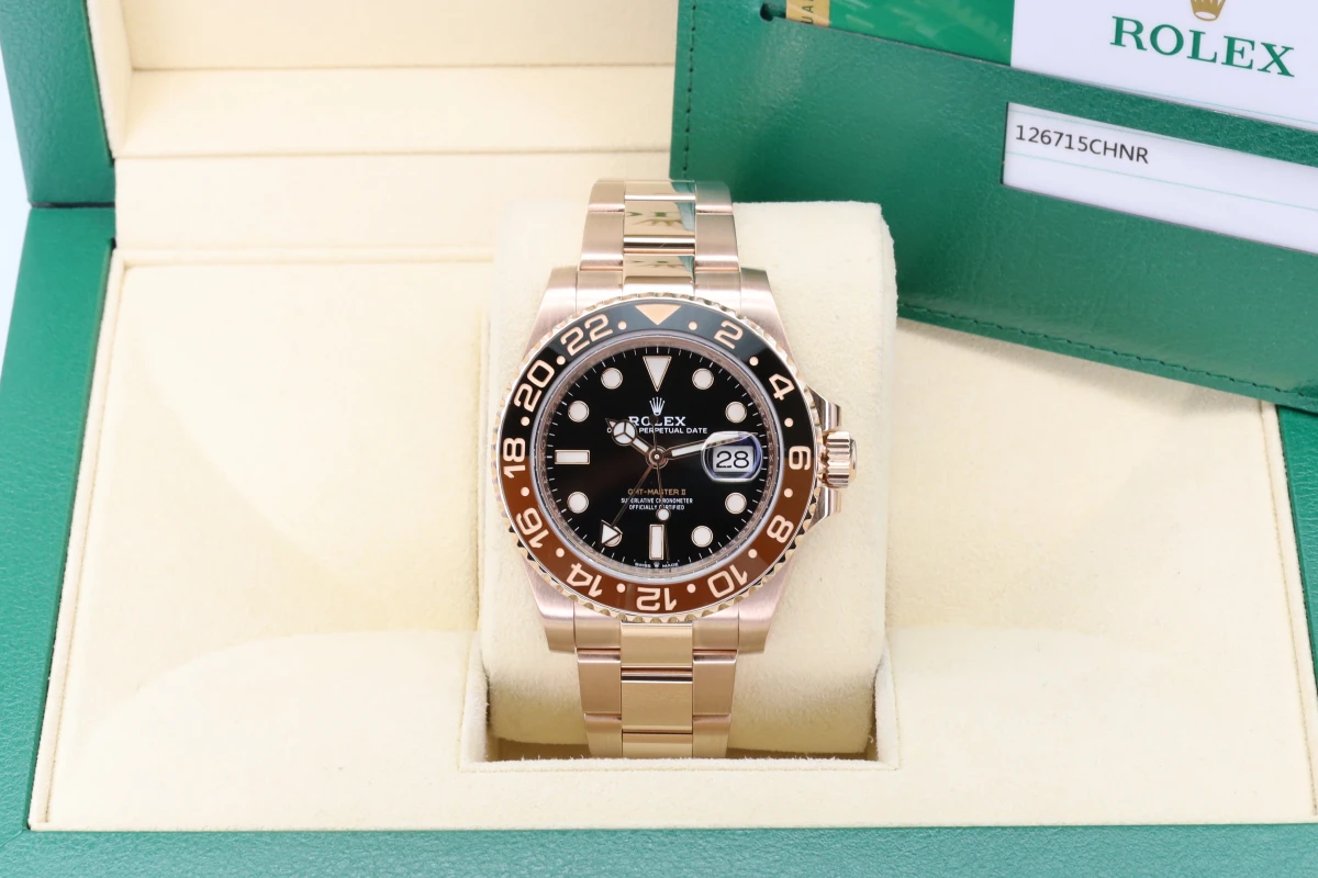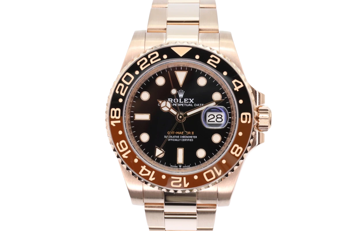 Rolex GMT-Master II 18ct Everose, best known as the "Rootbeer." This Watch sits on an 18ct Everose 40mm case with a two colour Black and Brown Ceramic bezel. The Rolex watch fixes onto an Oyster strap.
