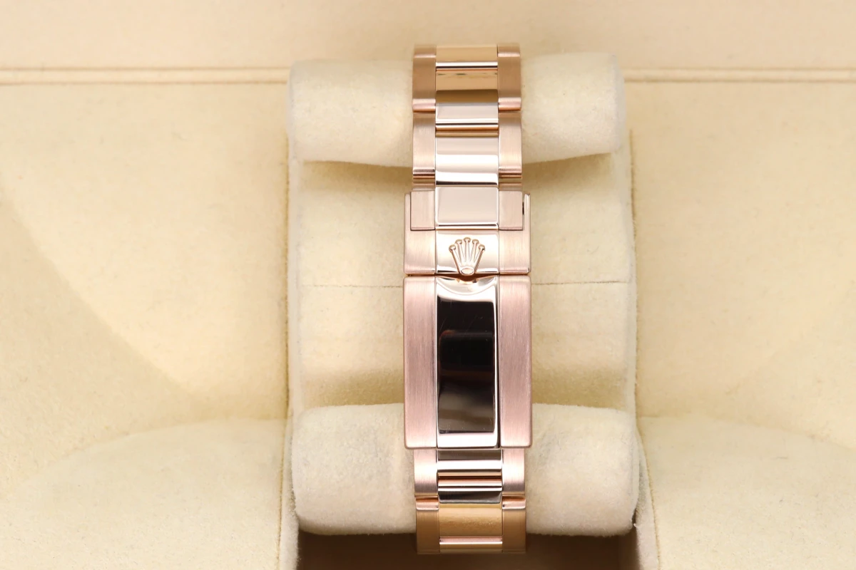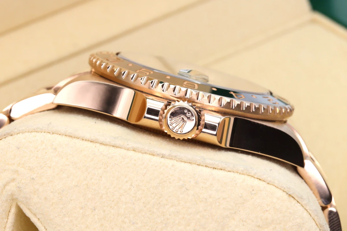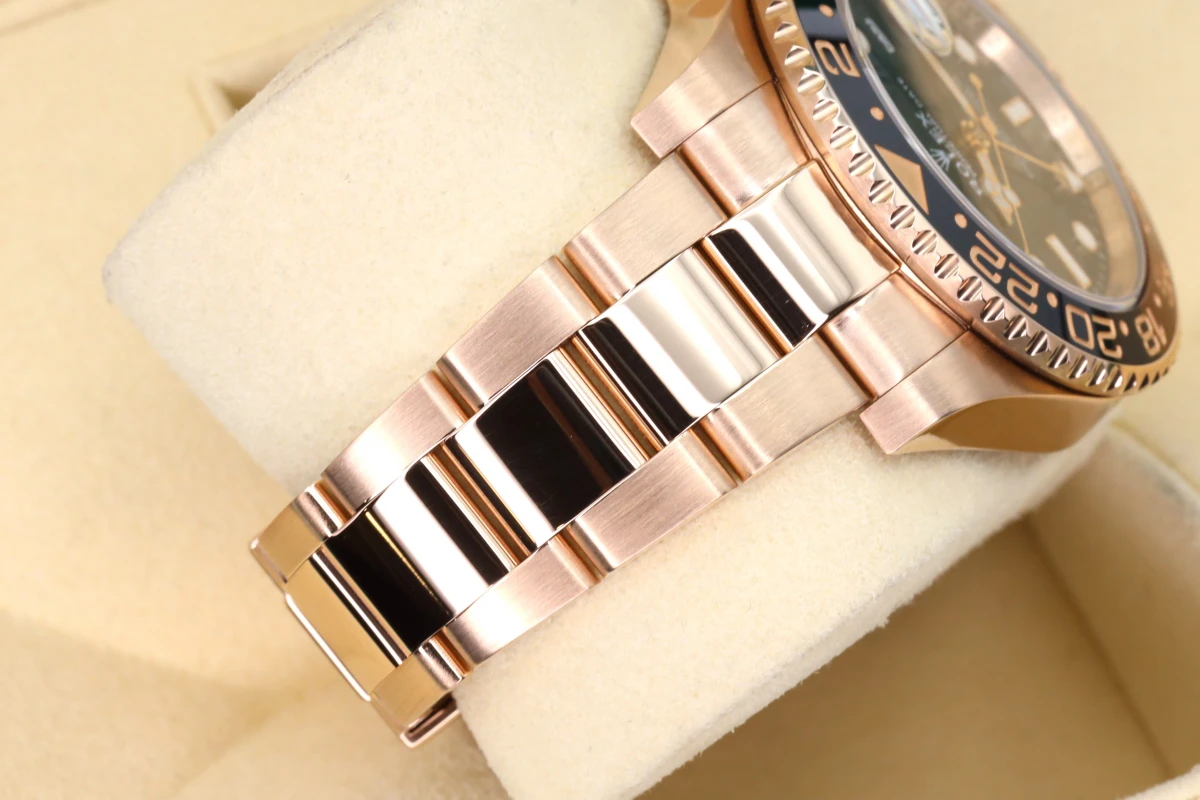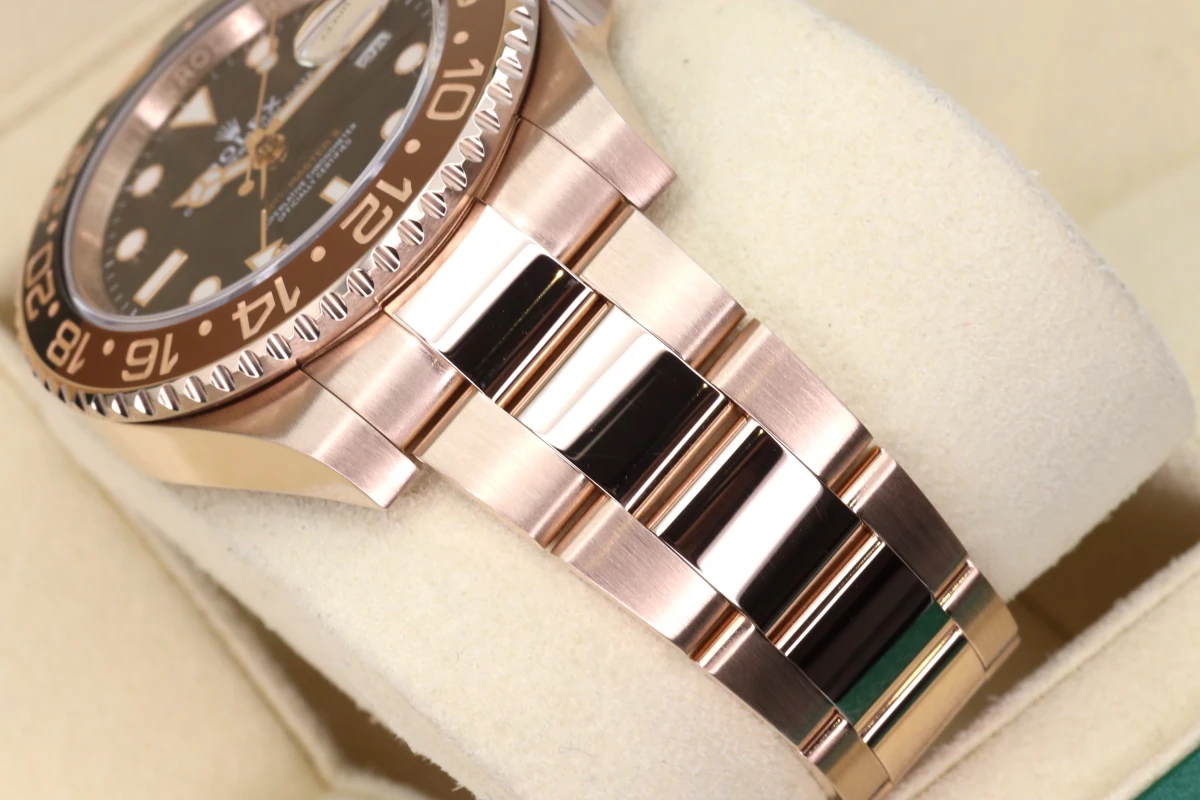 Rolex GMT-Master II 18ct Everose, best known as the "Rootbeer." This Watch sits on an 18ct Everose 40mm case with a two colour Black and Brown Ceramic bezel. The Rolex watch fixes onto an Oyster strap.
