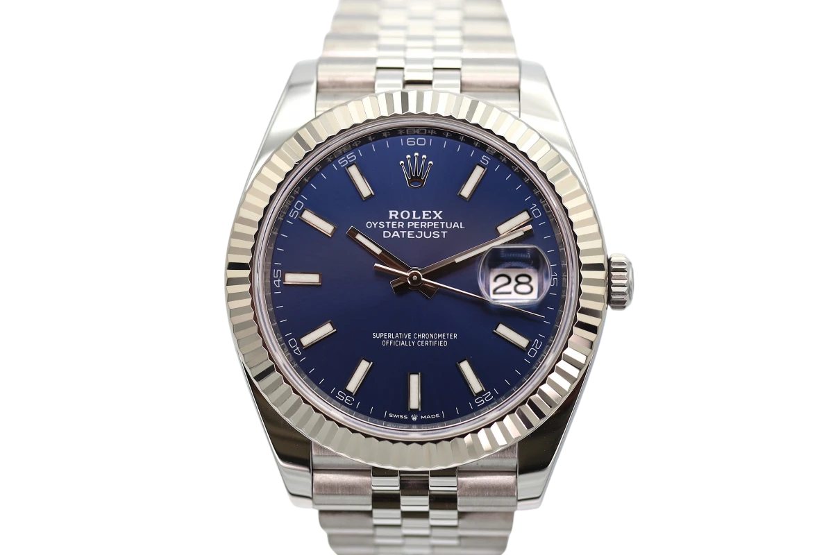 Rolex Datejust 41 Stainless steel Case and Jubilee bracelet, 18ct White gold fluted bezel & Blue baton dial. 2020 With Box & Papers Ref:126334