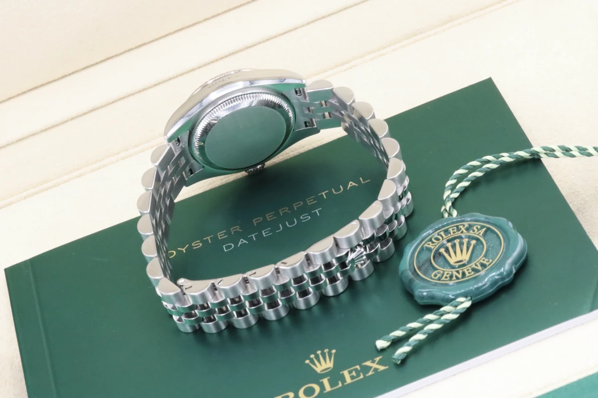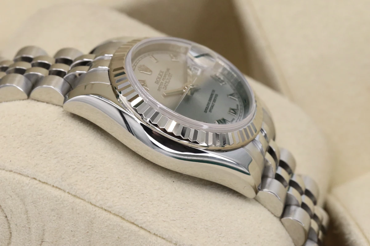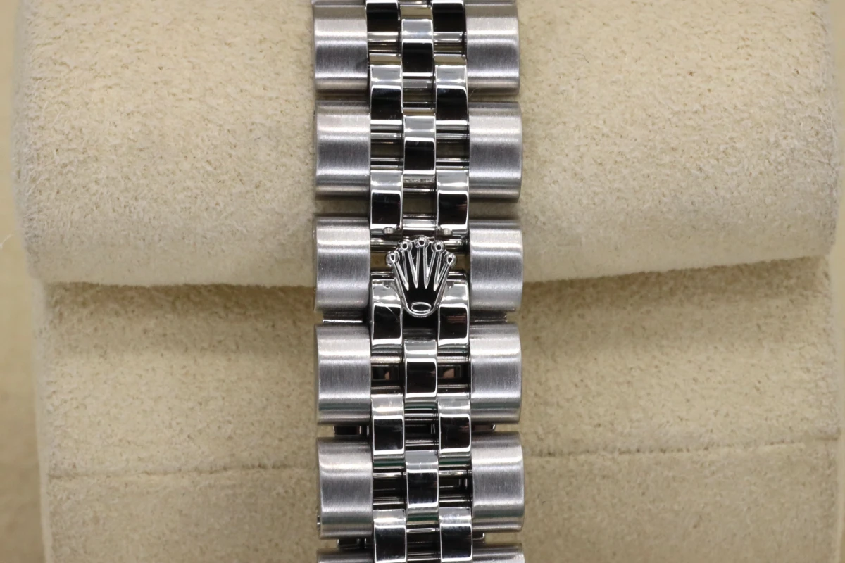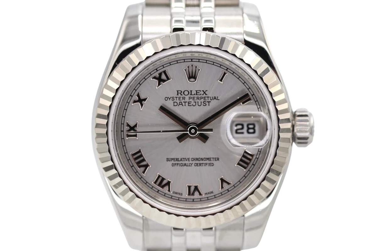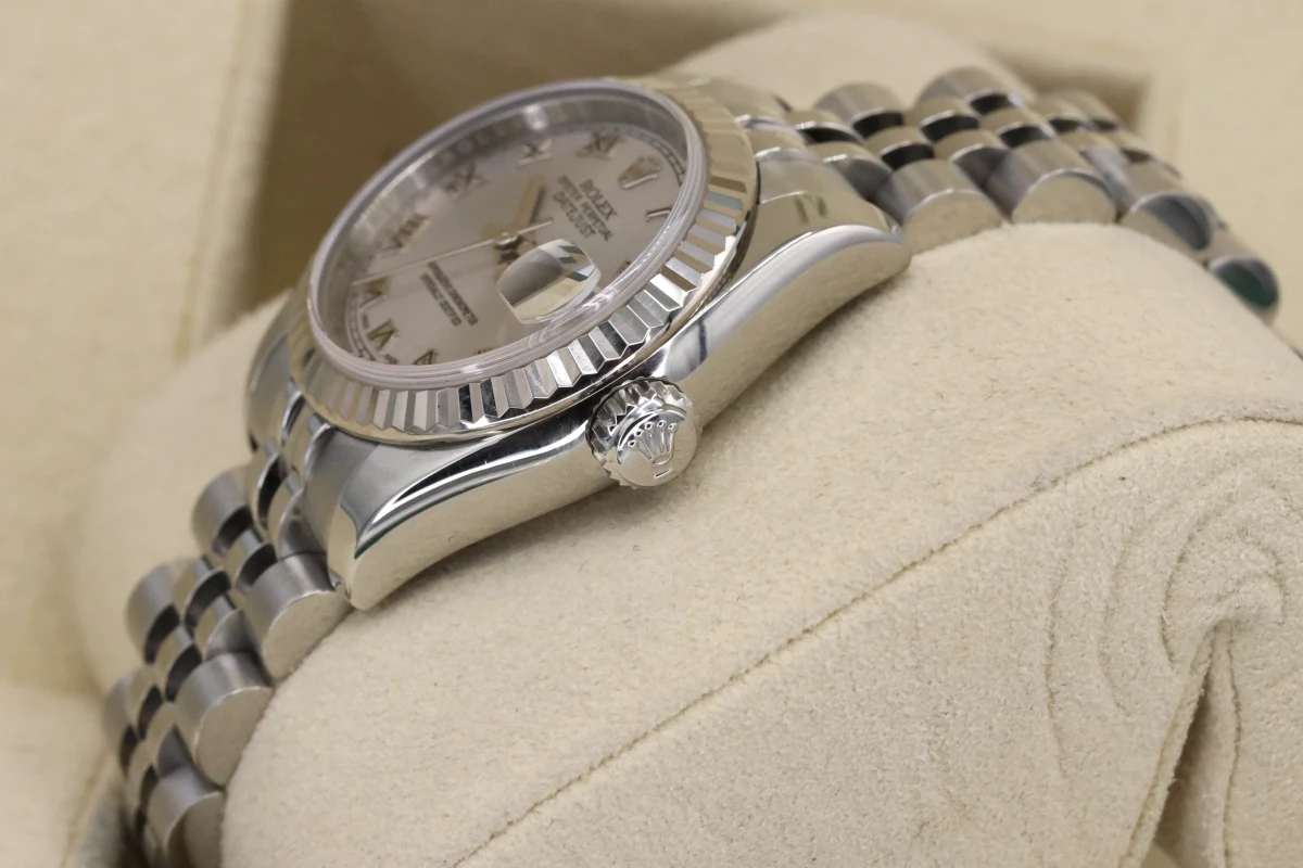 This 2009 Lady Rolex DateJust features a 26mm silver dial with roman numeral markers and a stainless steel jubilee bracelet, It is also fitted with as 18ct white gold fluted bezel.