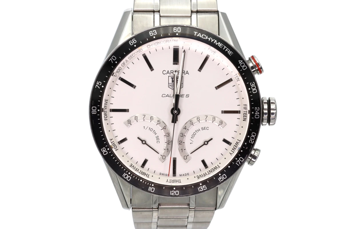 Tag Heuer Carrera Calibre S Full stainless steel with a 43mm case and white dial.