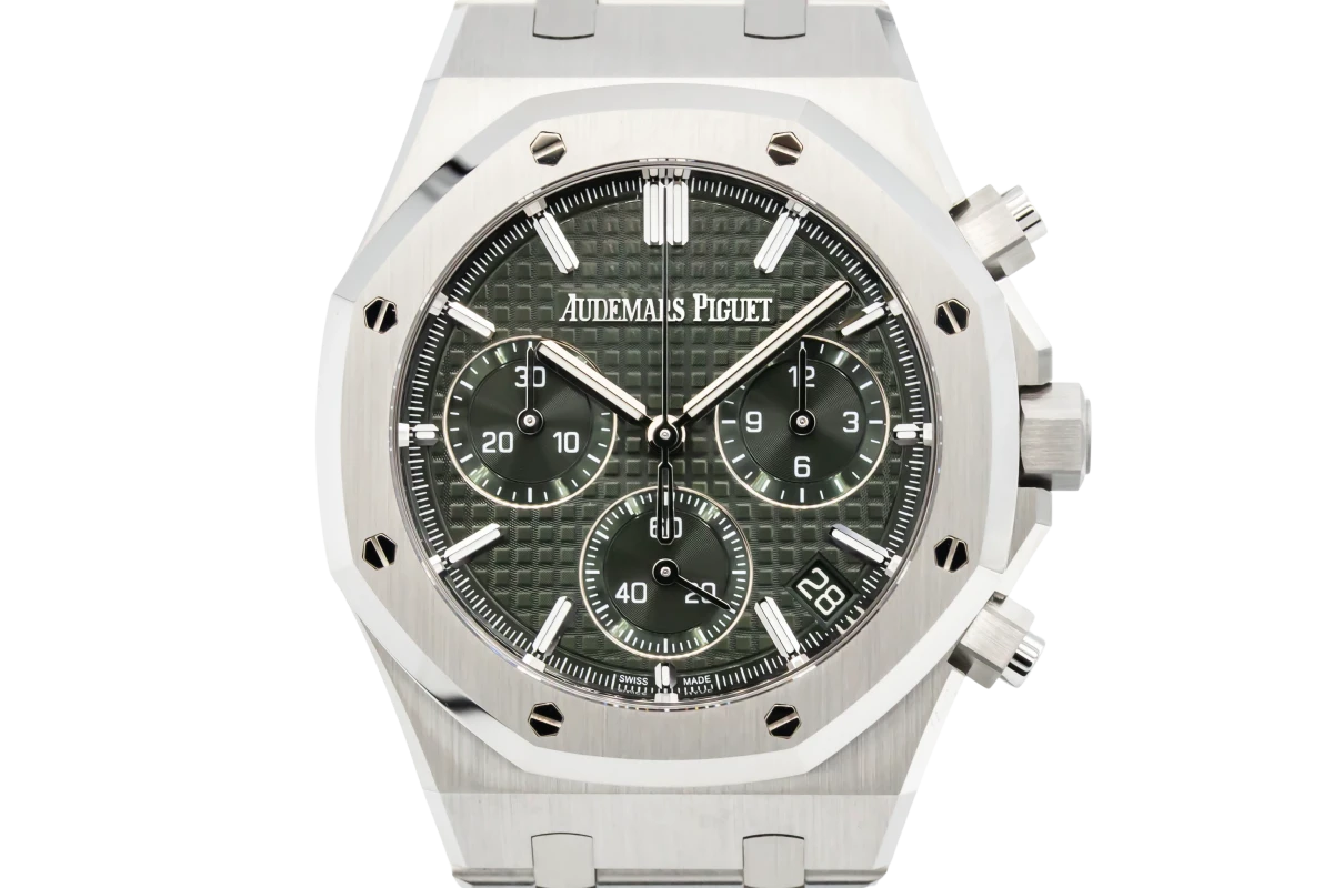 This 2023 Audemars Piguet Royal Oak Chronograph 41mm 50th anniversary features a green 'mega Tapisserie' dial with baton markers and a stainless steel bracelet. It also features a stainless steel bezel.