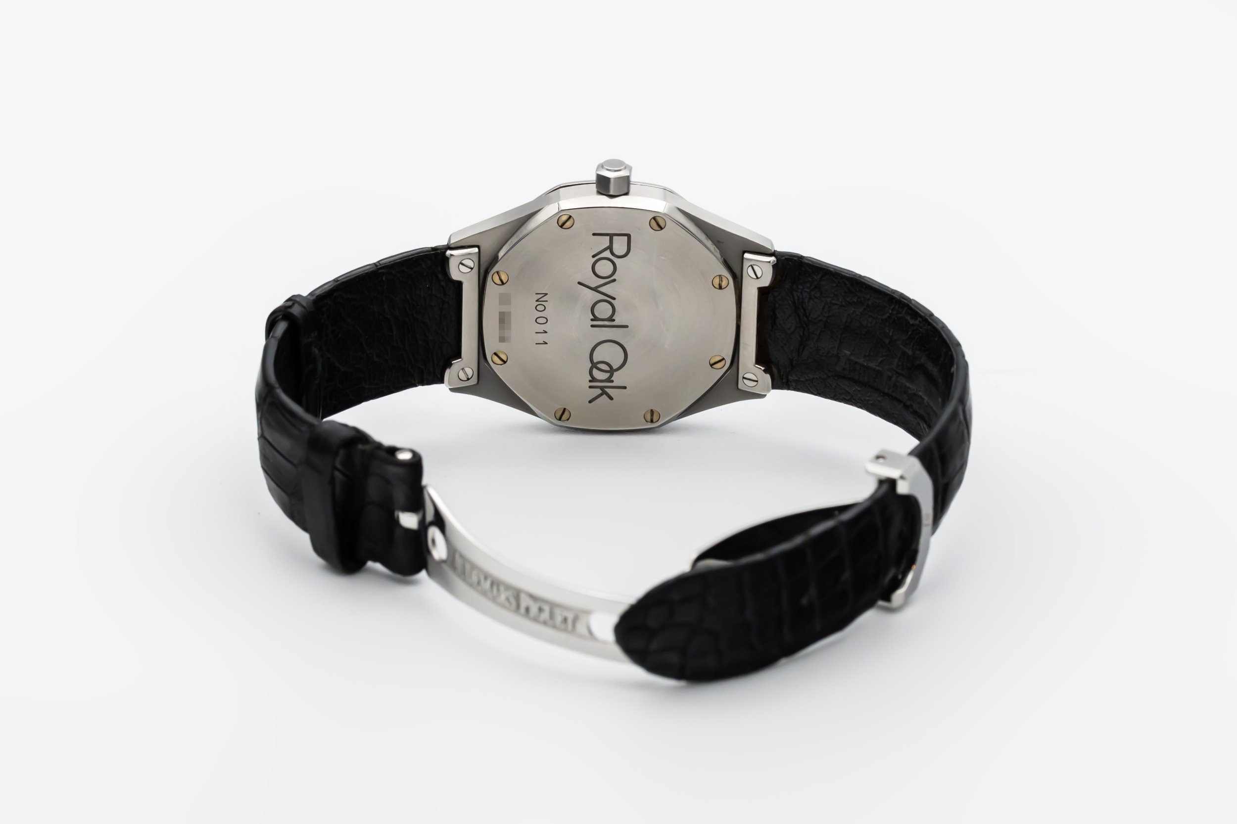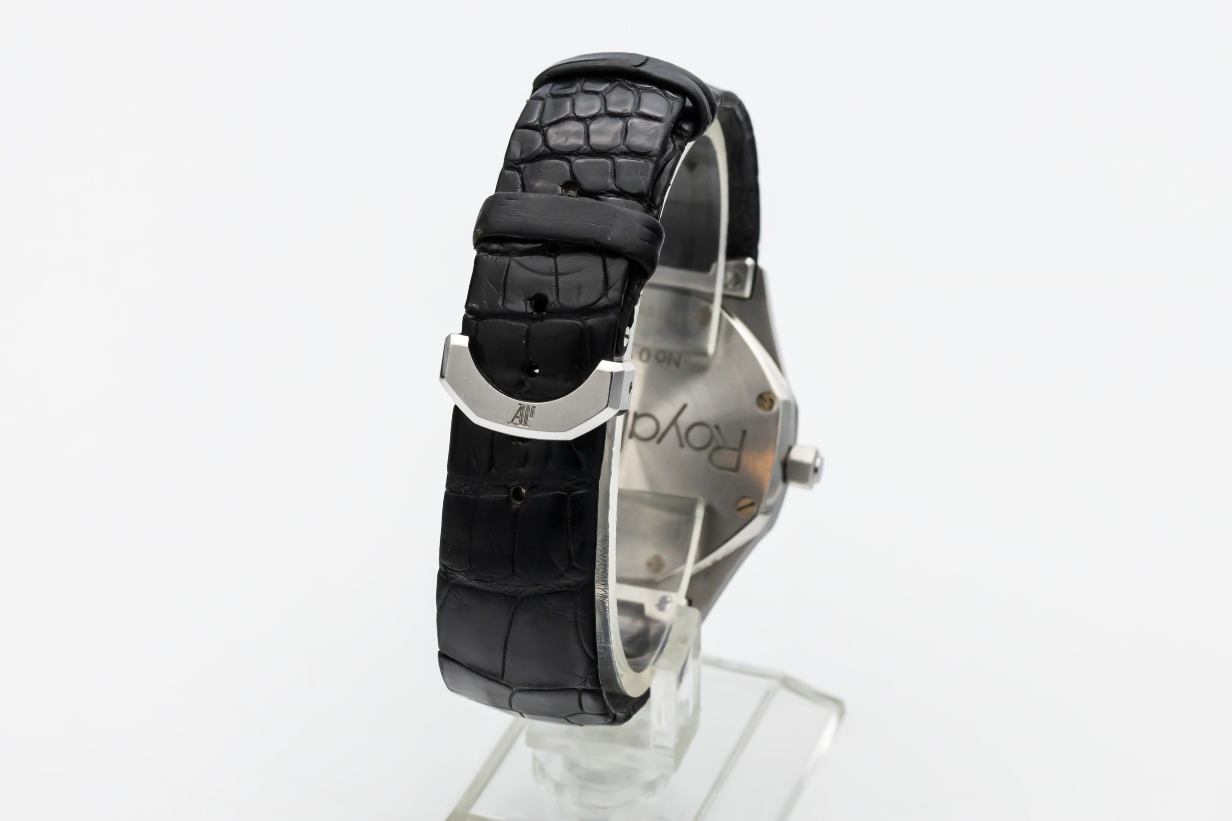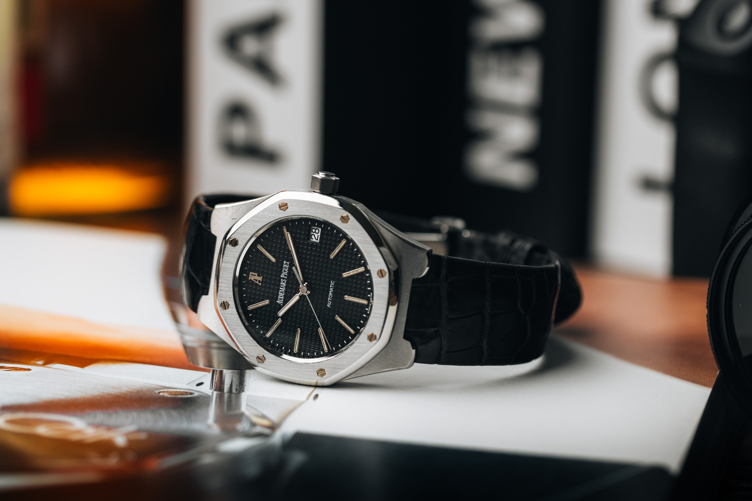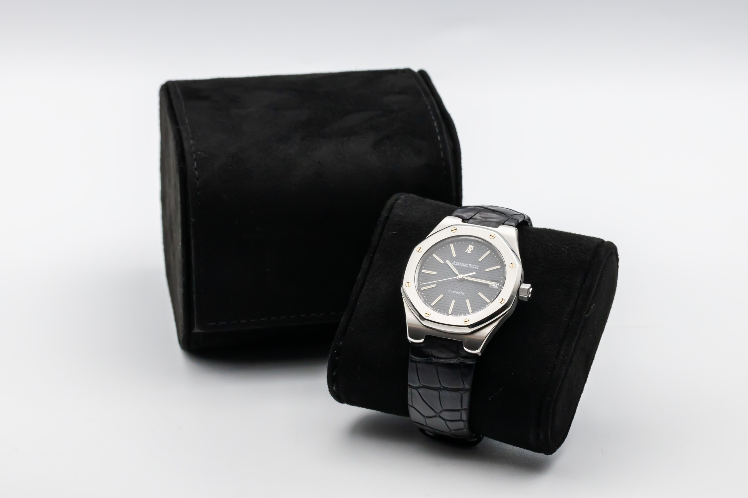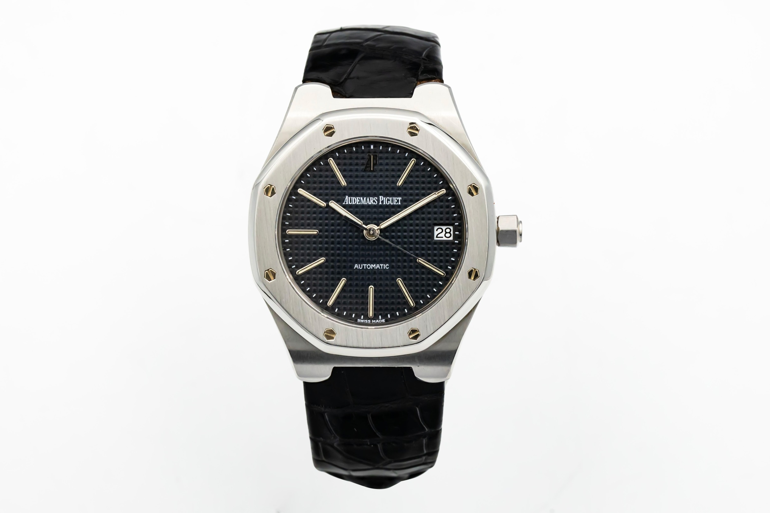 This Audemars Piguet Royal Oak Automatic 36mm is a refined luxury sports watch crafted in stainless steel. The classic dial features the signature “Petite Tapisserie” pattern with applied hour markers and slim baton hands for excellent legibility. Framed by the iconic octagonal bezel secured with exposed screws and finished on a black leather strap.