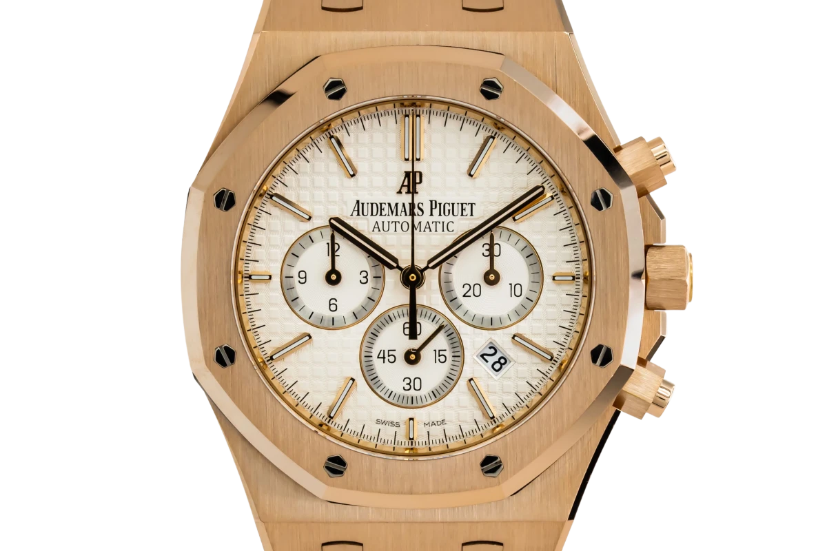 This 2017 Audemars Piguet Royal Oak Chronograph features a 41mm white 'Mega Tapisserie' dial with rose gold baton markers and a 18ct rose gold bracelet. It also features a a 18ct rose gold screw locked crown.