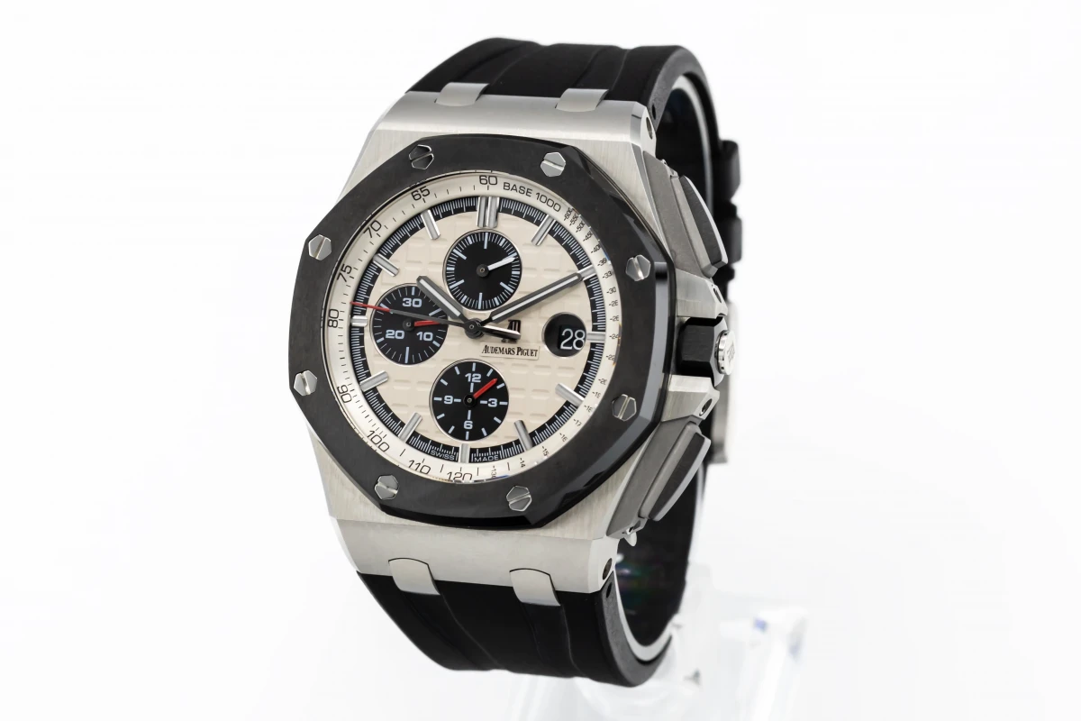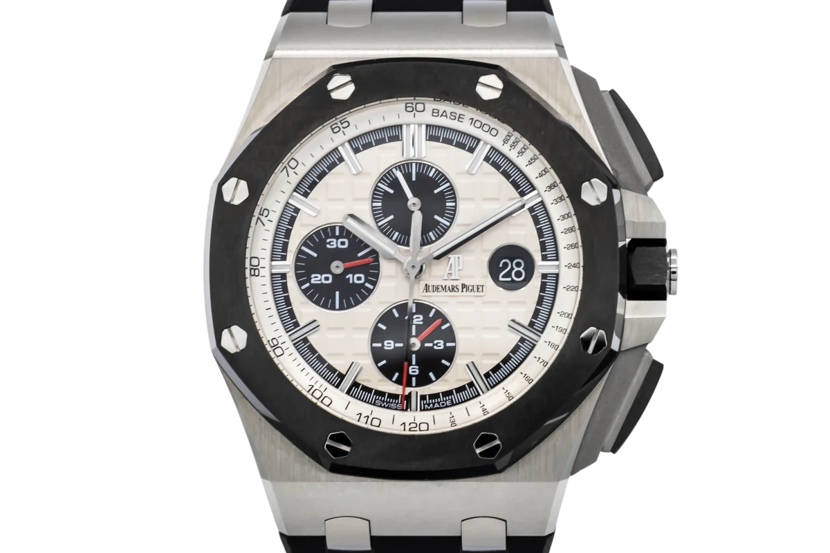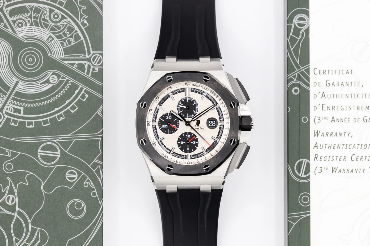 This 2012 Audemars Piguet Royal Oak Offshore chronograph 44mm features a white dial with white sub-dials and Arabic numerals. The watch comes on a black rubber bracelet. It also features a stainless steel screw locked crown.