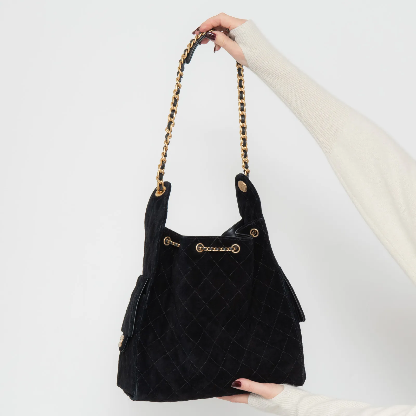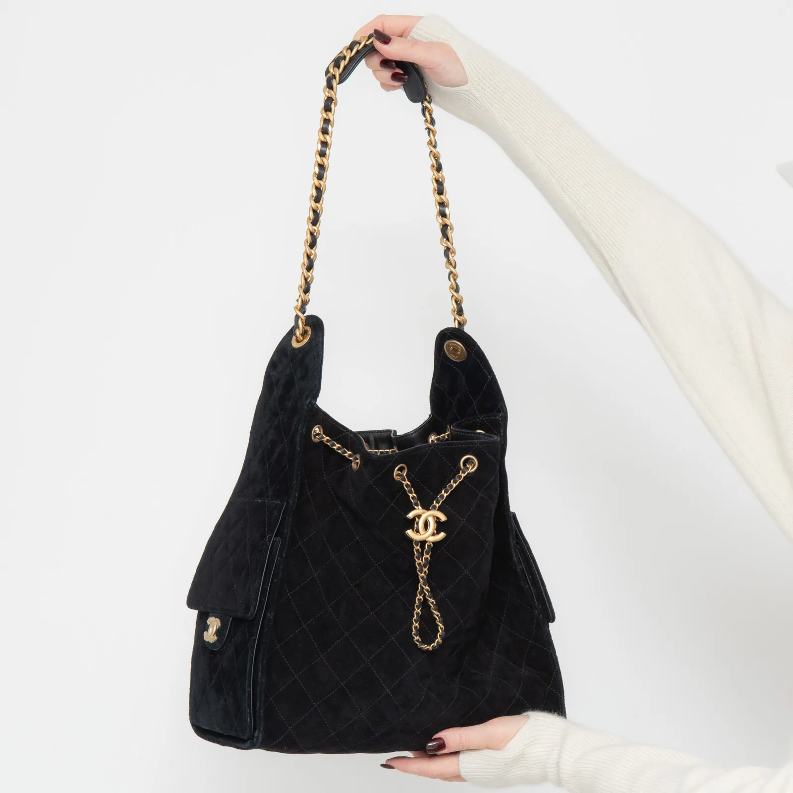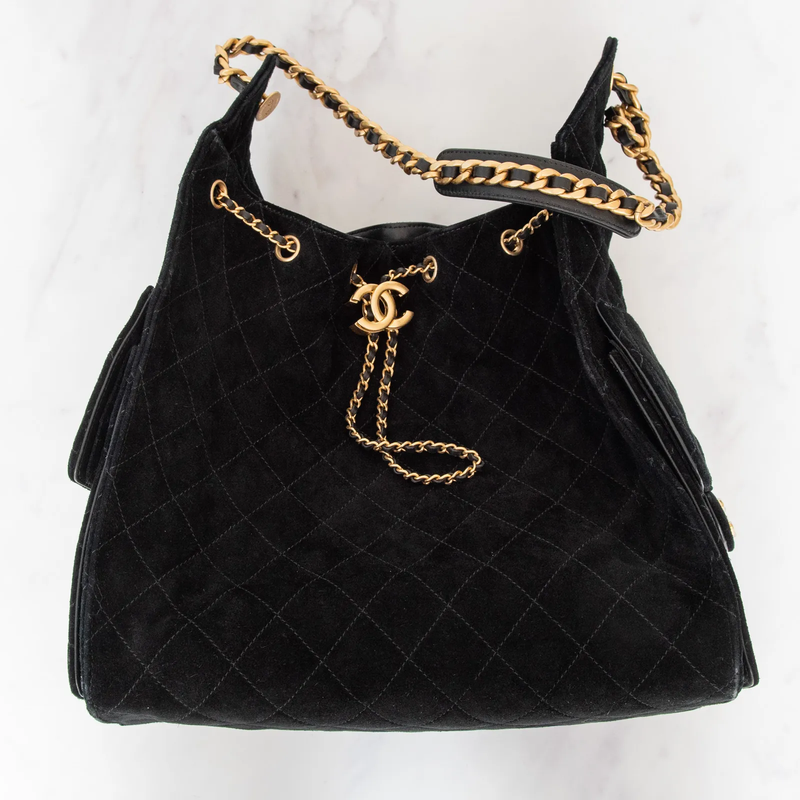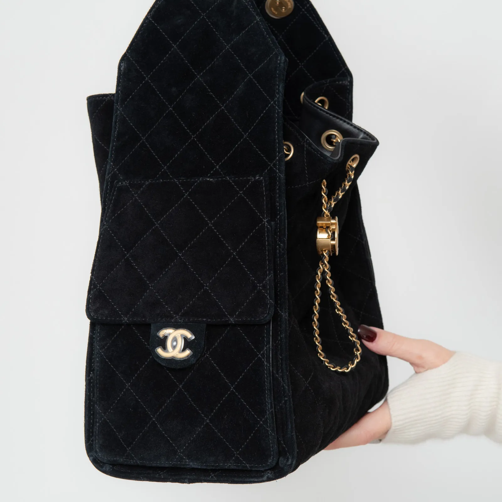 • Carry on shoulder, black suede leather diamond stitch detail, single interweave chain and leather shoulder strap, side pockets with turnlock closure