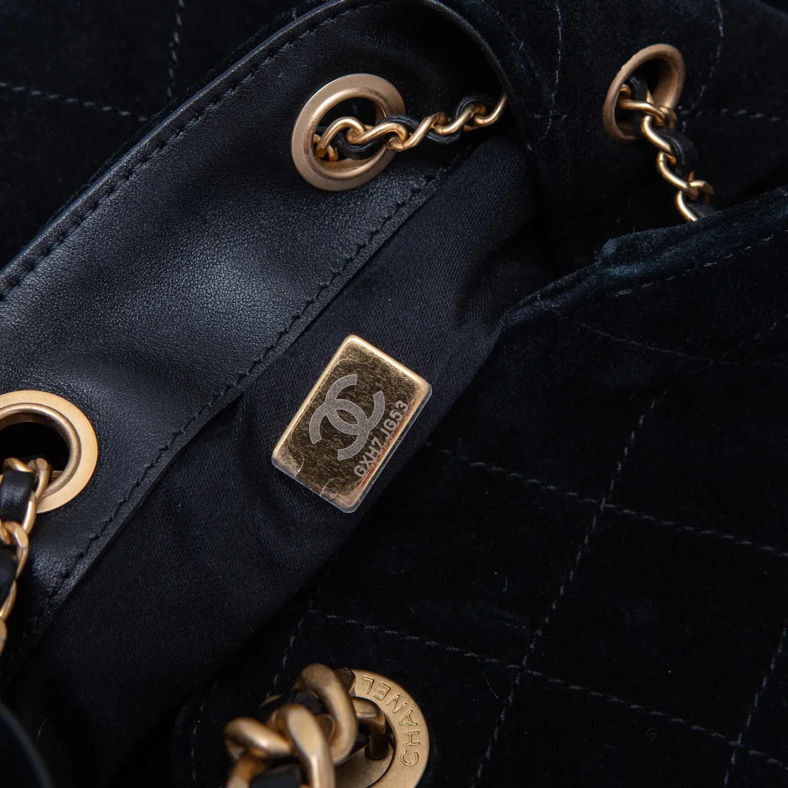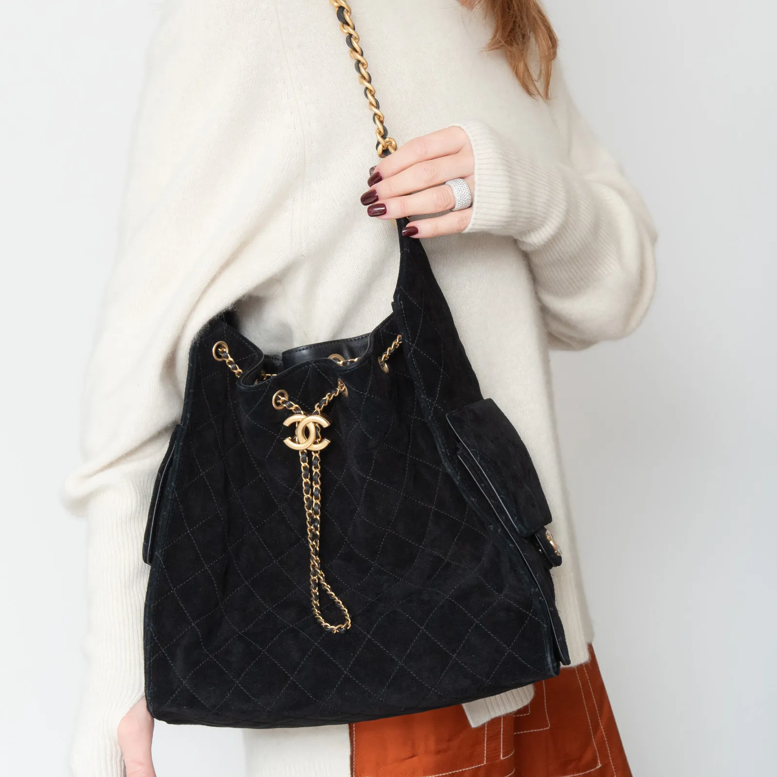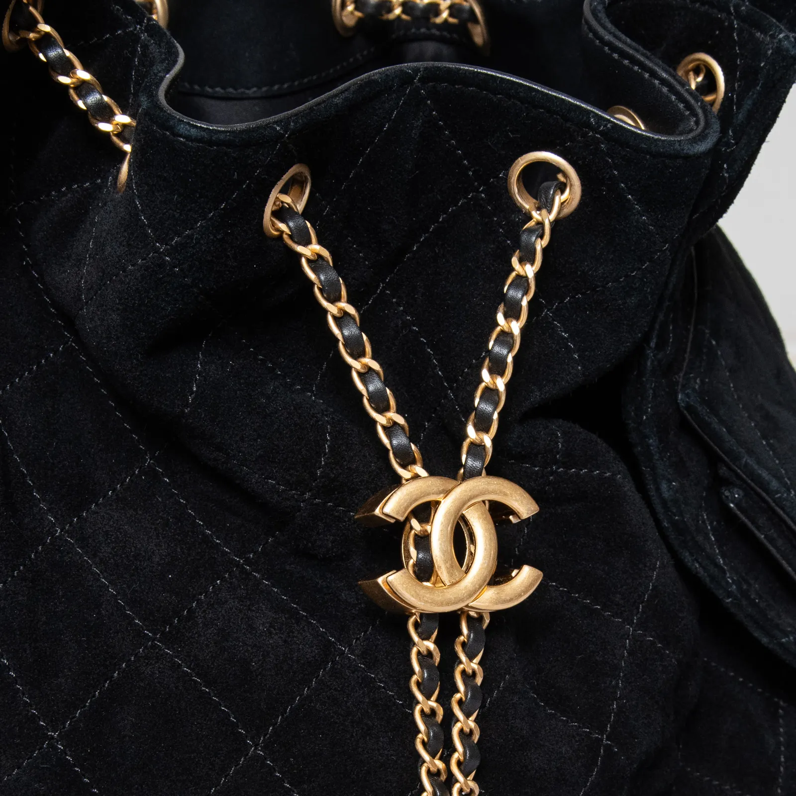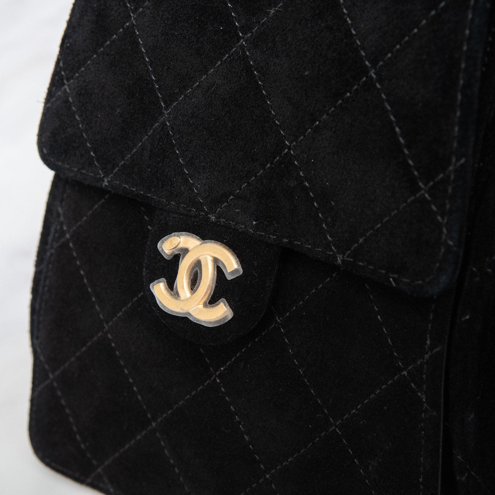 • Carry on shoulder, black suede leather diamond stitch detail, single interweave chain and leather shoulder strap, side pockets with turnlock closure
