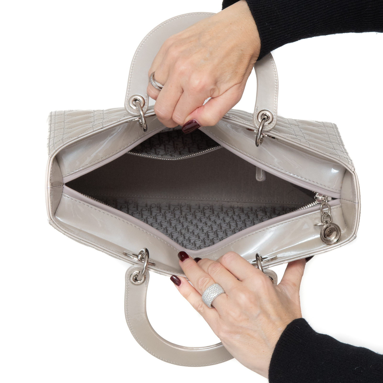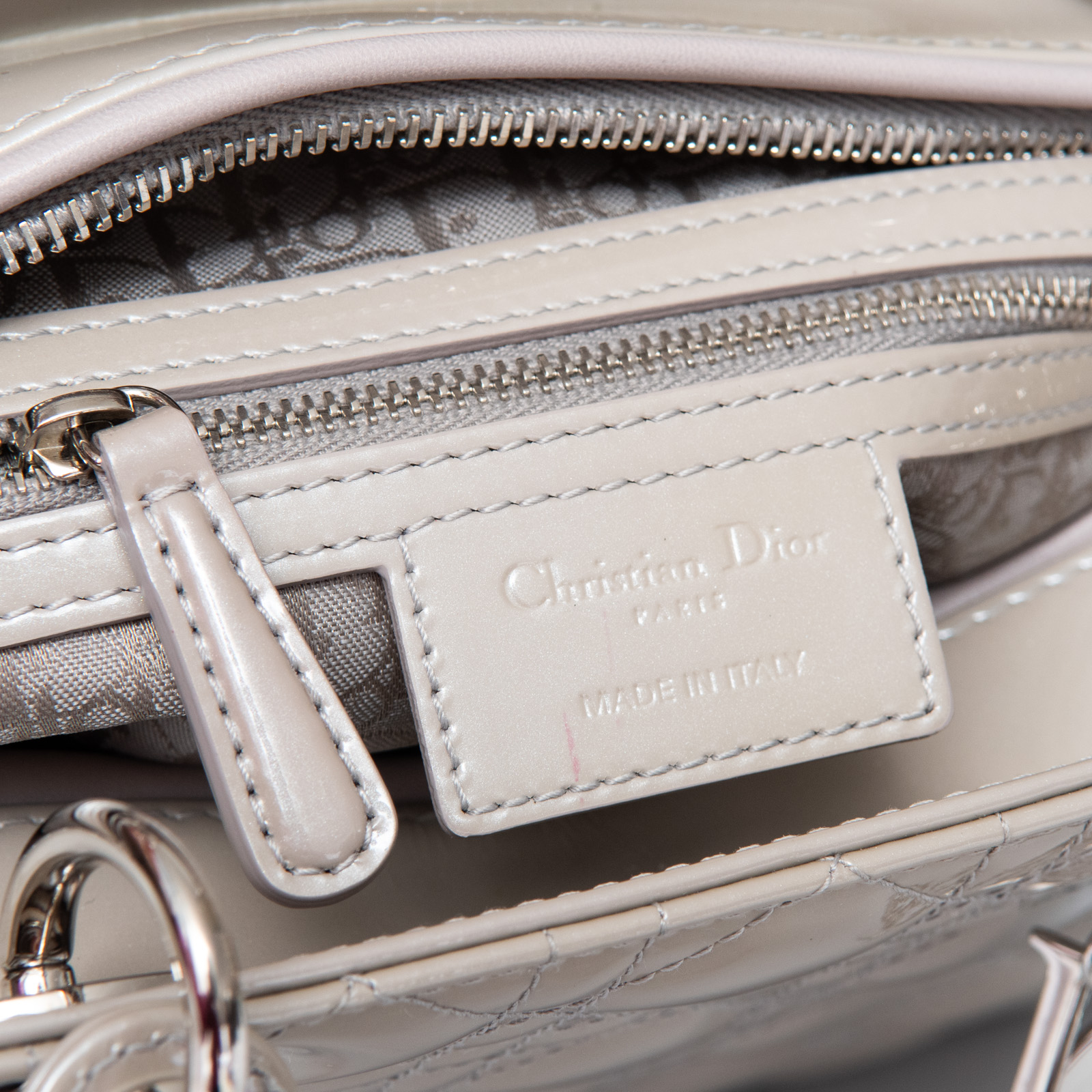 • Grey patent leather, cannage stitch detail, silver tone hardware, removable long patent leather strap, Dior letters
