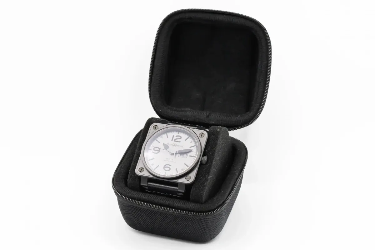 This circa 2010 Bell & Ross 46mm features a white quarter arabic dial with a black leather bracelet. It also features a stainless steel bezel.