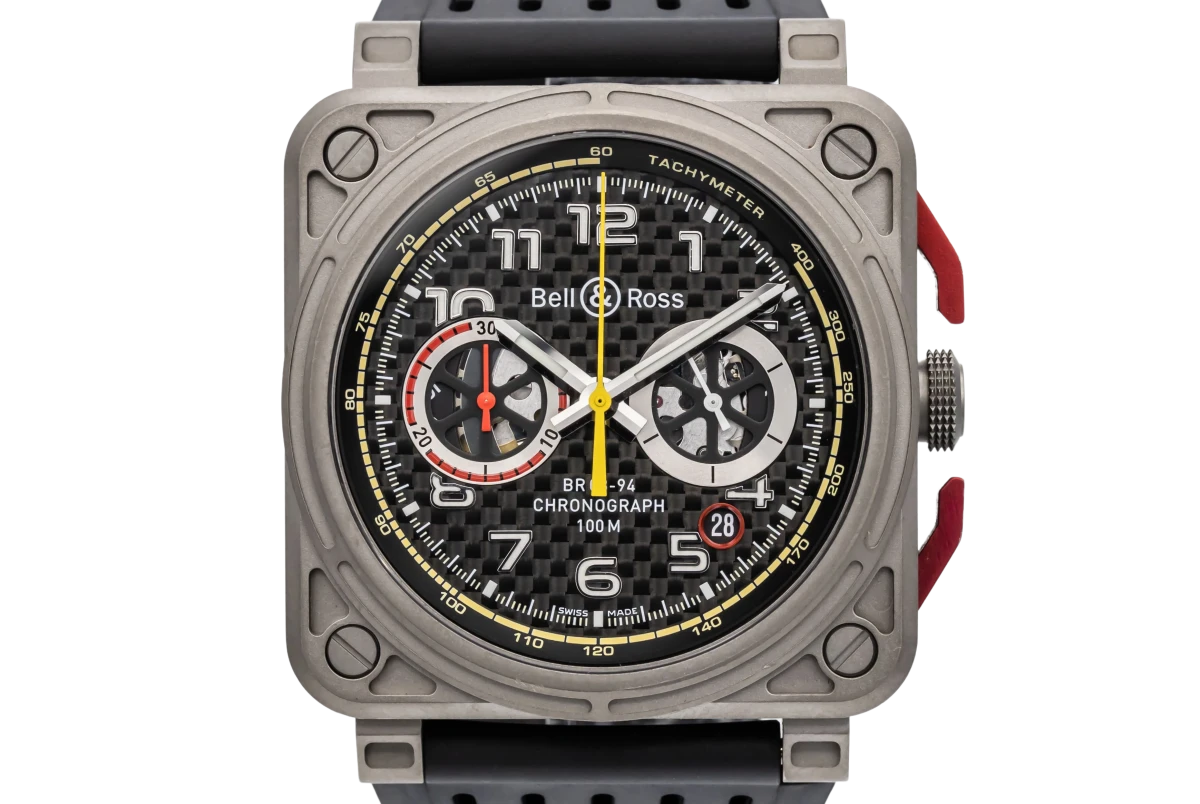 This 2012 Bell and Ross BR X1 RS18 Renault Sport Formula One watch boasts an aesthetic inspired by the world of motor racing with a 44mm microblasted titanium case with striking yellow rocker pushers and a tinted sapphire crystal case back.