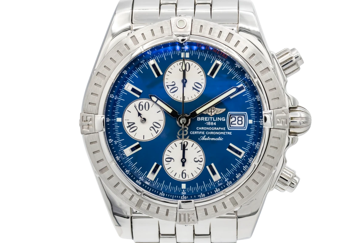 This 2005 Breitling Chronomat Chronograph 44mm features a blue dial, baton markers, 3 silver sub dials and a stainless steel bracelet. It also features a stainless steel bezel.