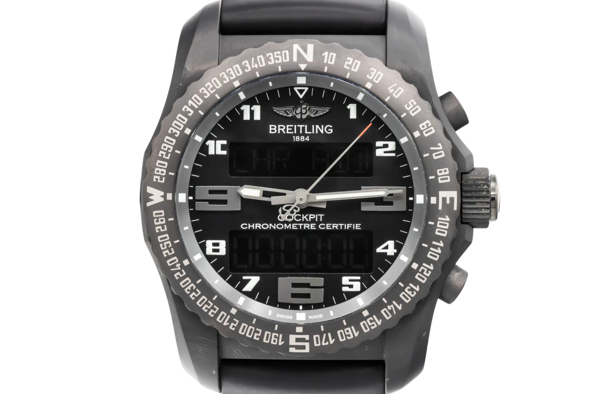 The watch has been designed with utility in mind and is equipped with Breitling’s ‘SuperQuartz’ movement, which provides the wearer with a range of useful functions displayed on two digital readouts on the dial. The bi-directional bezel is marked with compass bearings and can be used in conjunction with the analogue hands to assist the wearer with navigation.