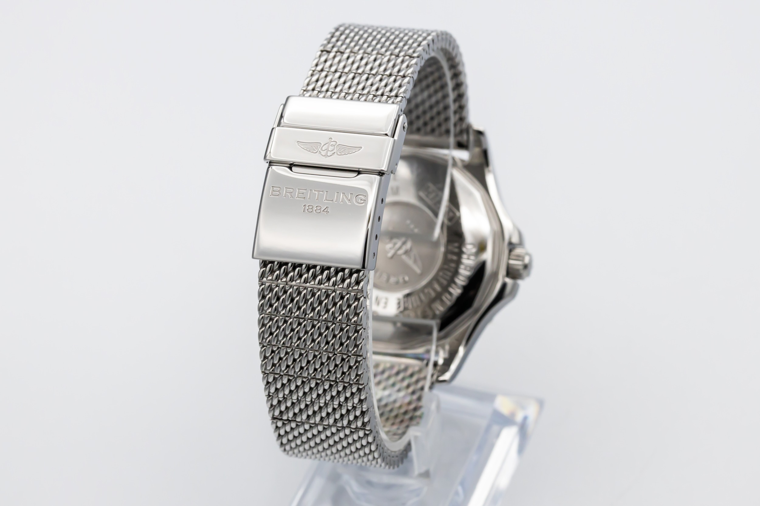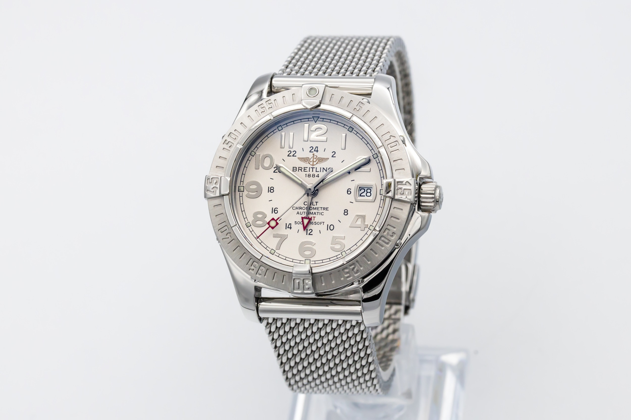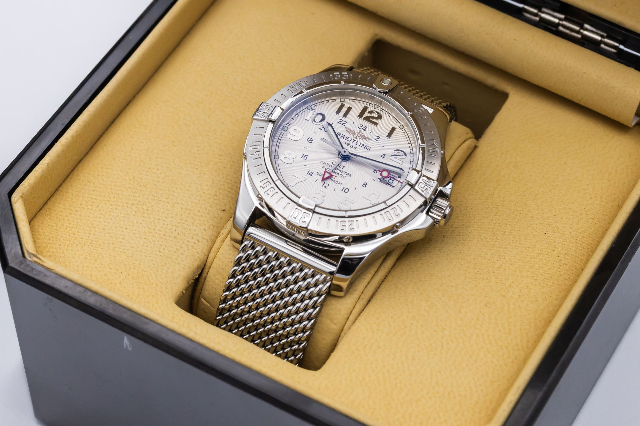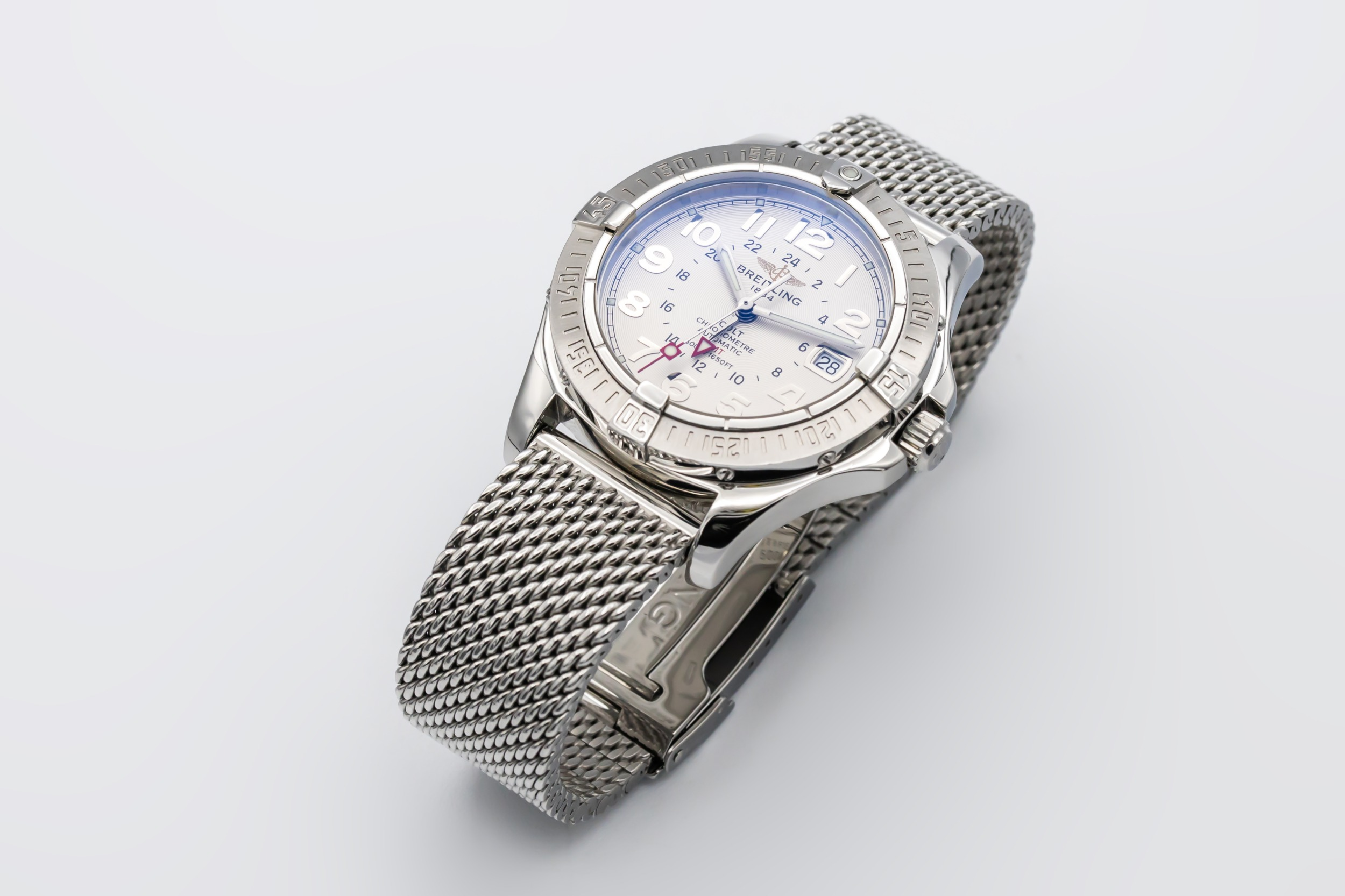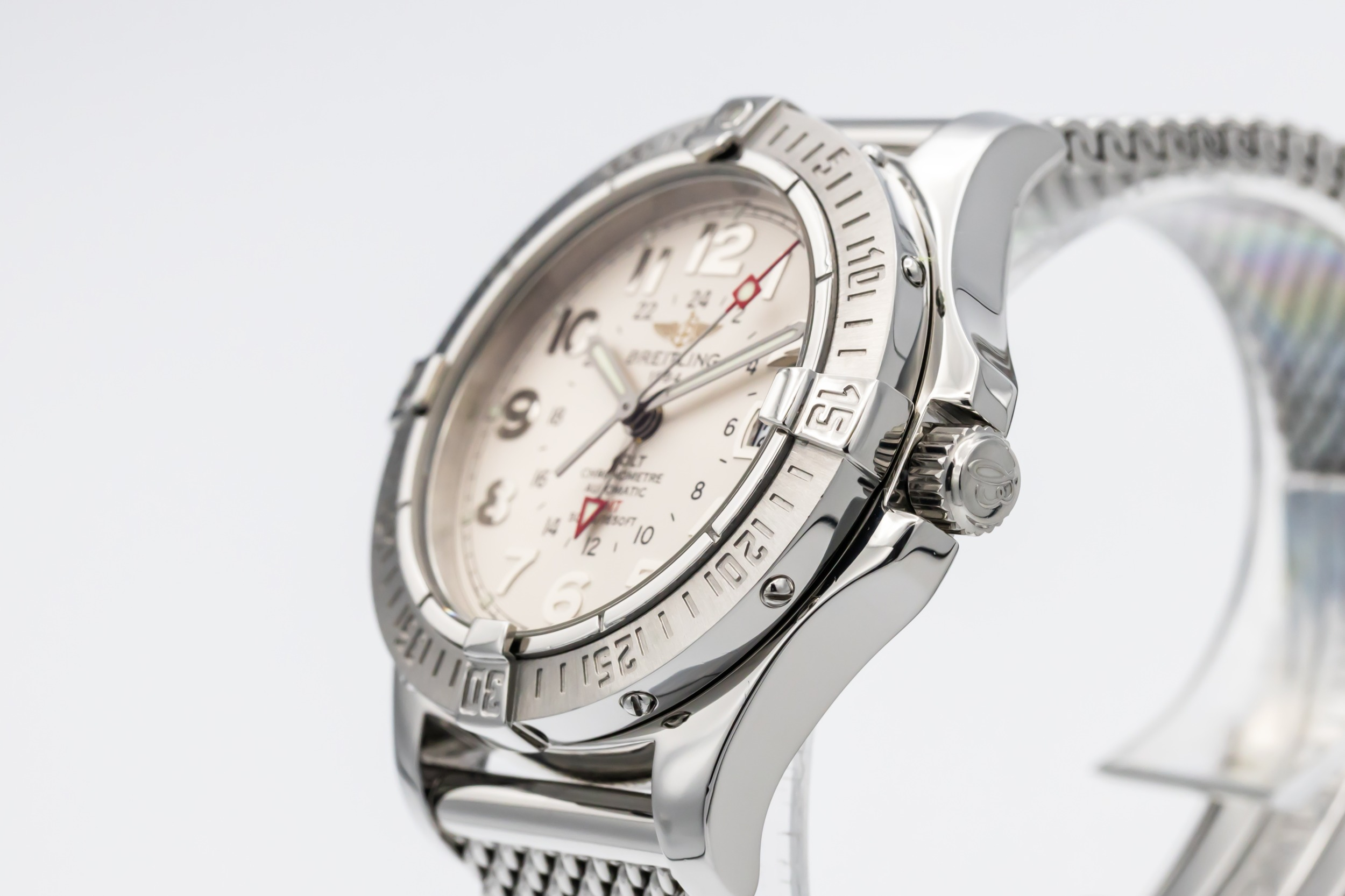 This Breitling Colt GMT 40mm features a white dial that is accented with luminous Arabic numerals and hands for excellent legibility, while a fourth GMT hand in a contrasting colour allows tracking of a second time zone. The date window sits at 3 o’clock, providing everyday practicality. Fitted to a sturdy stainless steel bracelet with a secure folding clasp, this Colt GMT balances tool-watch ruggedness with refined, wearable proportions.
