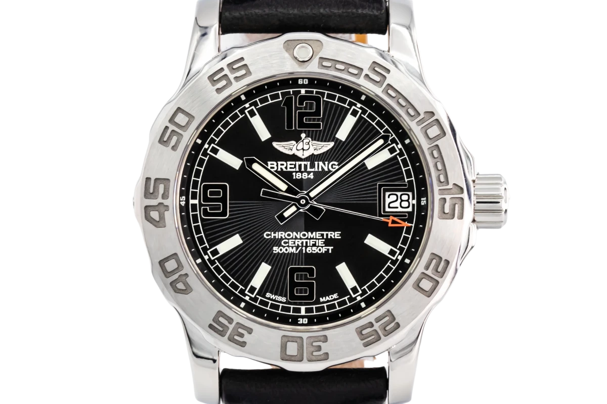 This 2013 Breitling Colt features a black dial with stainless steel baton markers and a black leather bracelet. It is also fitted with a stainless steel bezel.