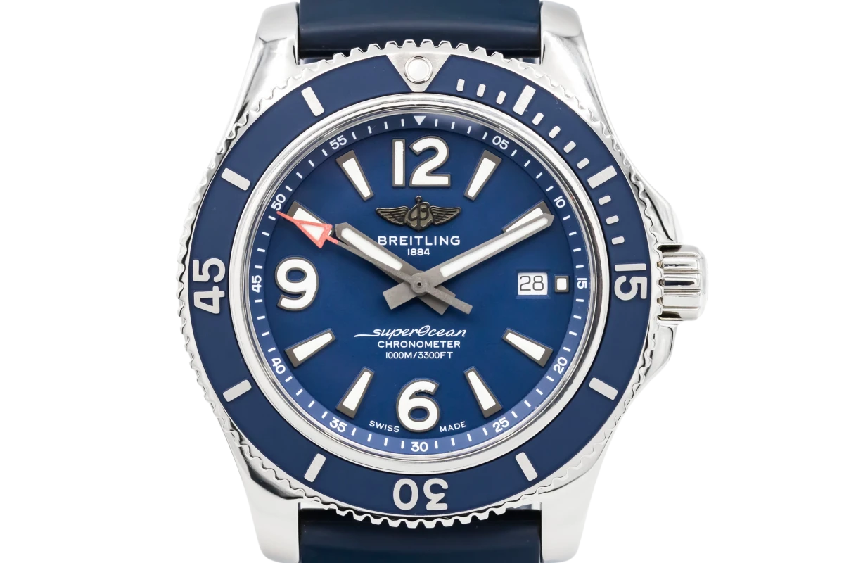 This 2019 Breitling Superocean 44mm features a blue dial with baton markers and a blue rubber bracelet. It also features a blue uni-directional bezel.