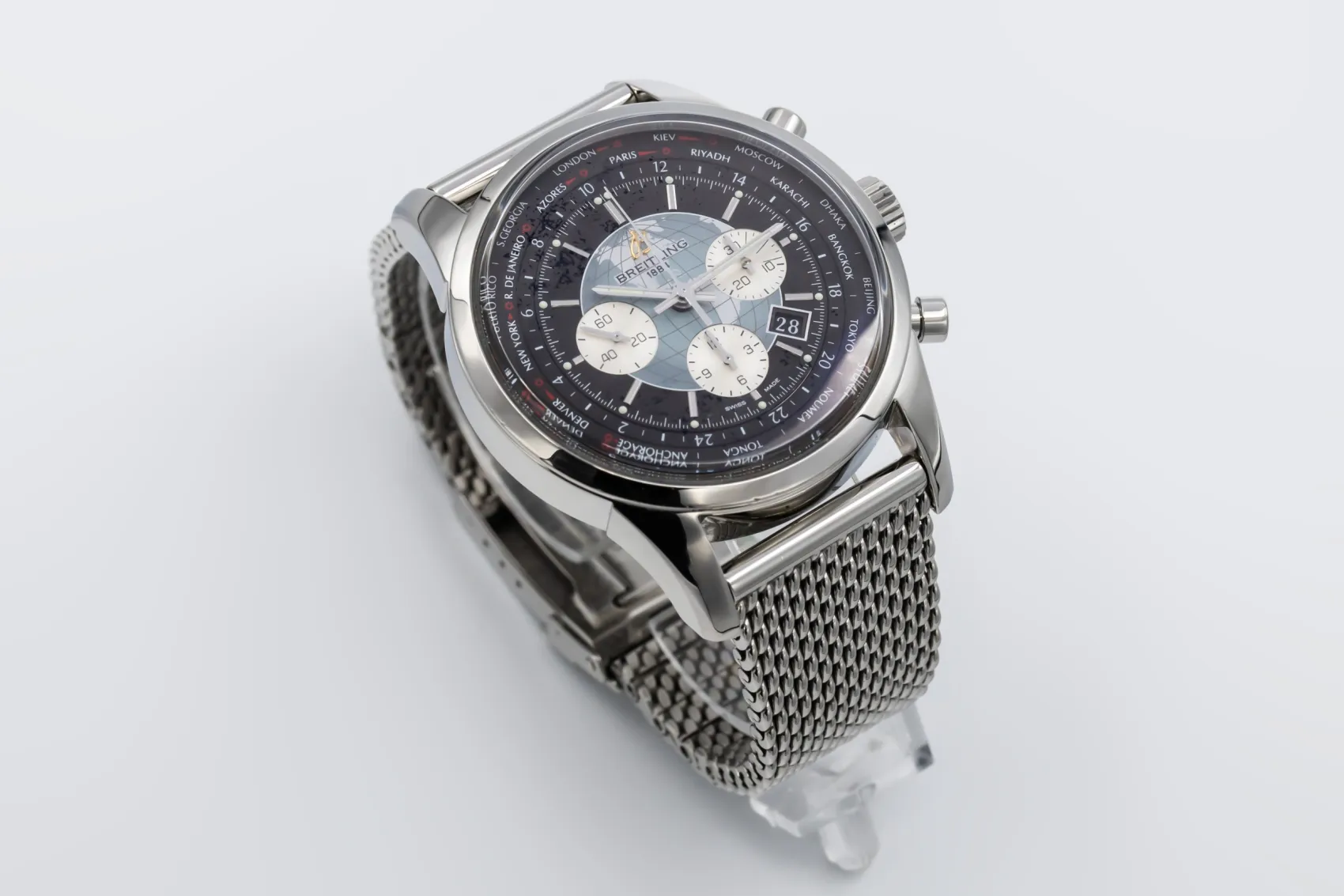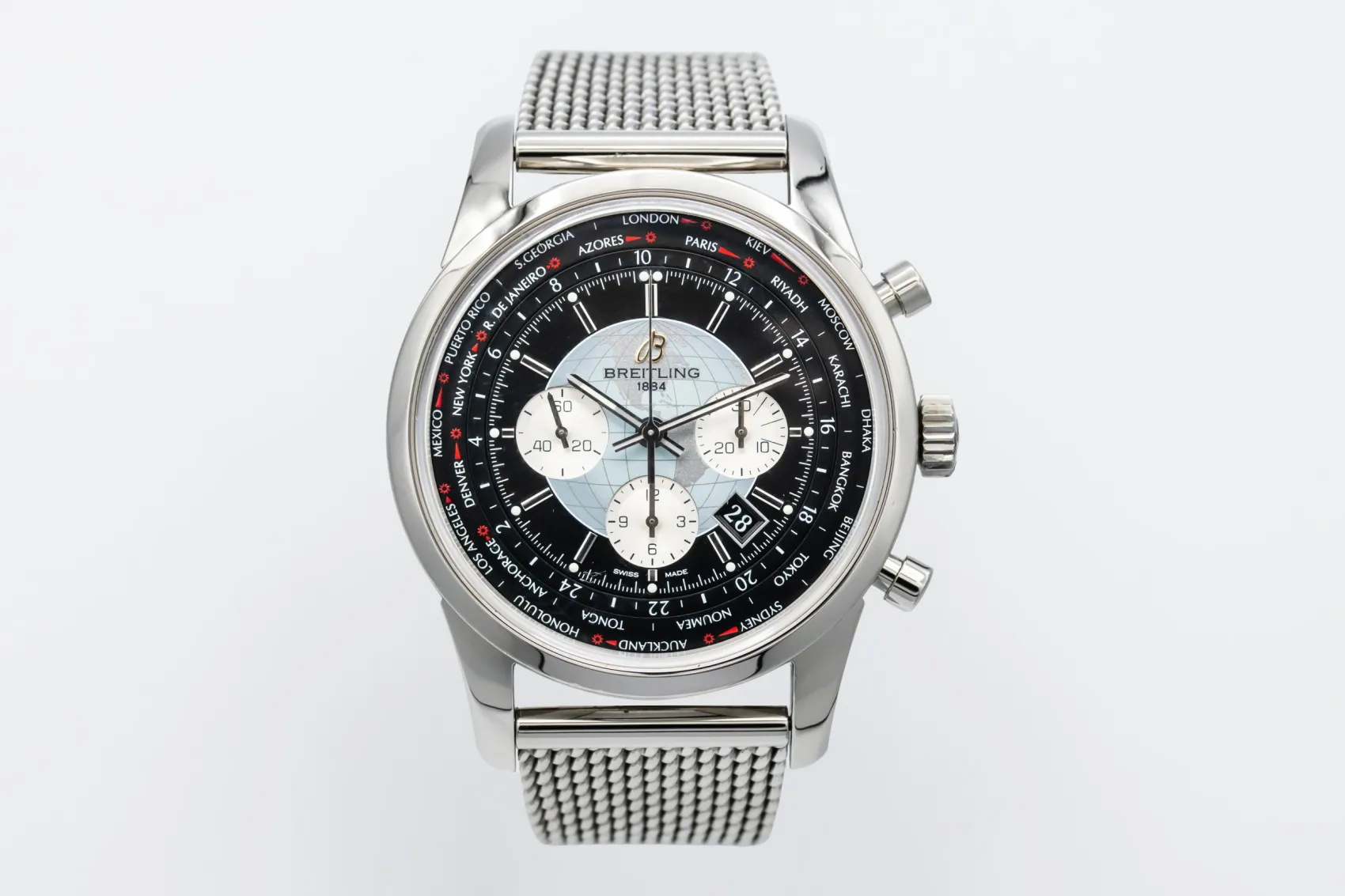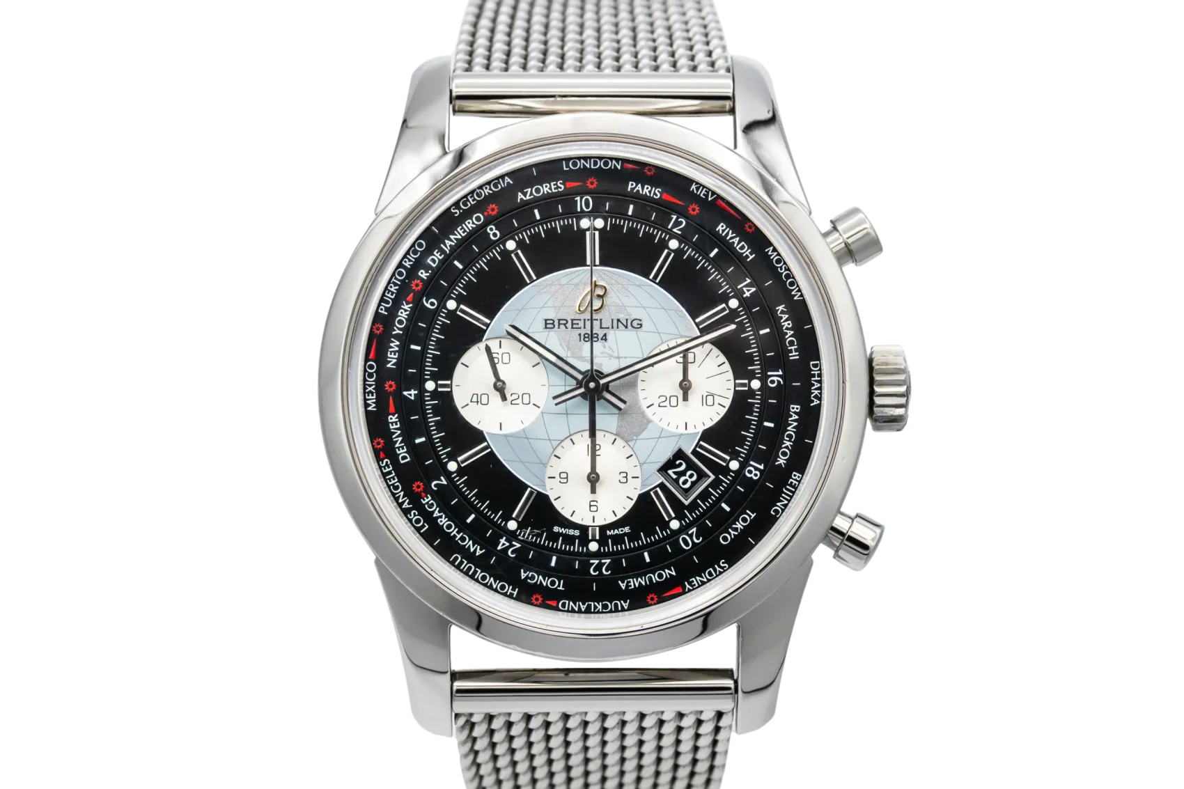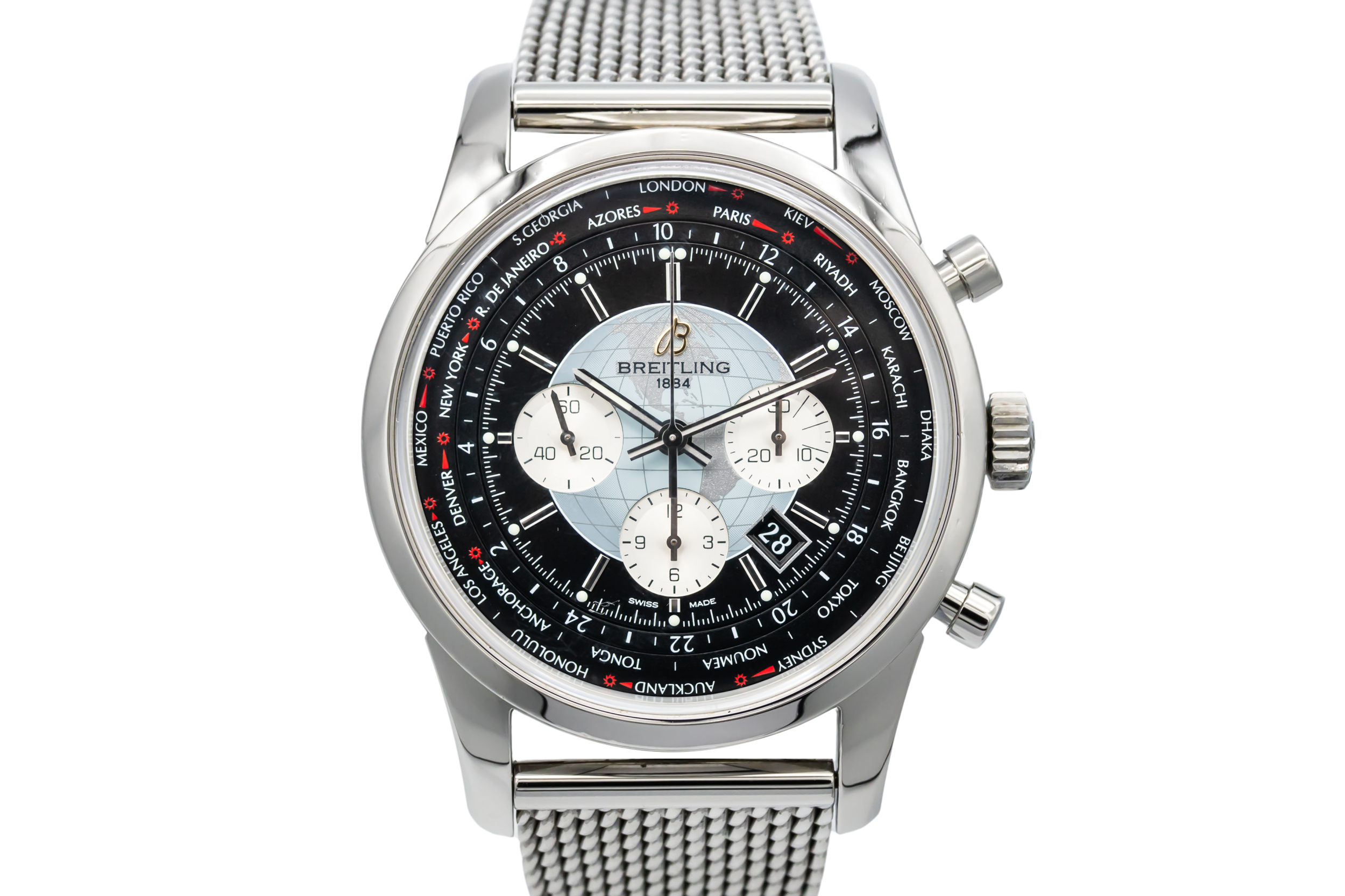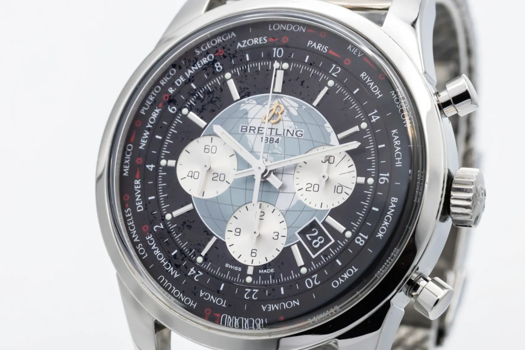finance this from £62.48 p/m call the shop Read about our Limited Lifetime WarrantyThis circa 2012 Breitling Transocean Chronograph Unitime 46mm is a sophisticated timepiece crafted in stainless steel, featuring a black dial with world time display, chronograph sub-dials and date function. Finished with a stainless steel bracelet and classic polished bezel.