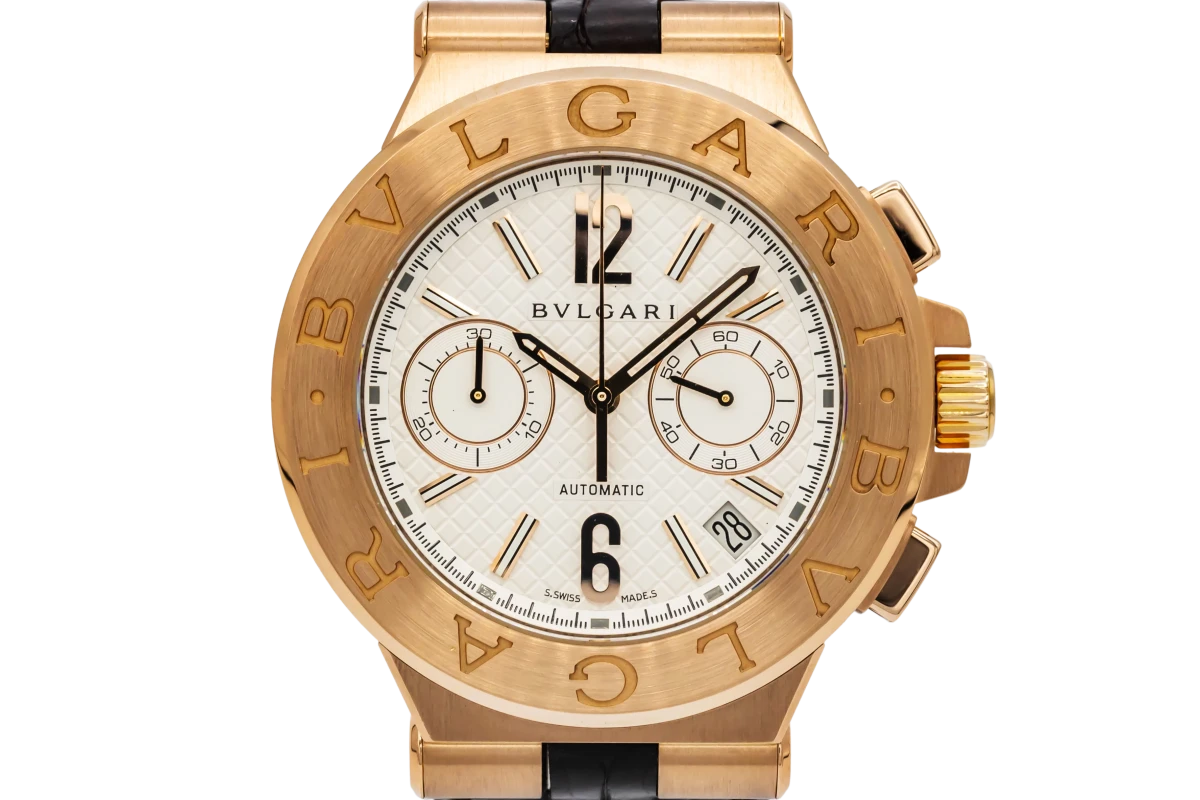 This 2010 Bulgari Diagono chrono 41mm features a white dial with baton markers and a brown leather bracelet. It also features a 18ct rose gold bezel.