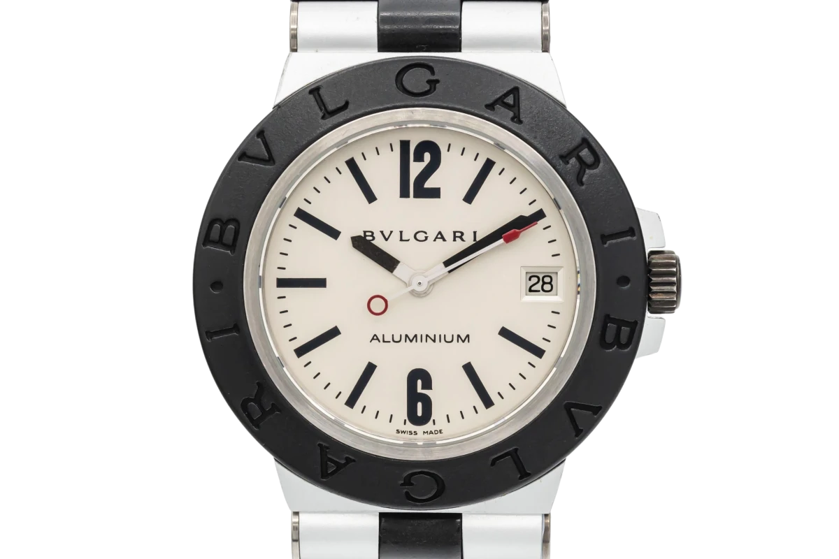In 1988, Bvlgari introduced the Diagono. It was the brand’s first foray into the realm of sports watches. The name reportedly came from both the diagonal slope of the bezel and the Greek word agón, meaning “contest.” Produced in steel with a quartz chronograph movement, the design was notable for its use of the Bvlgari logo on the bezel and its integrated strap/bracelet design.