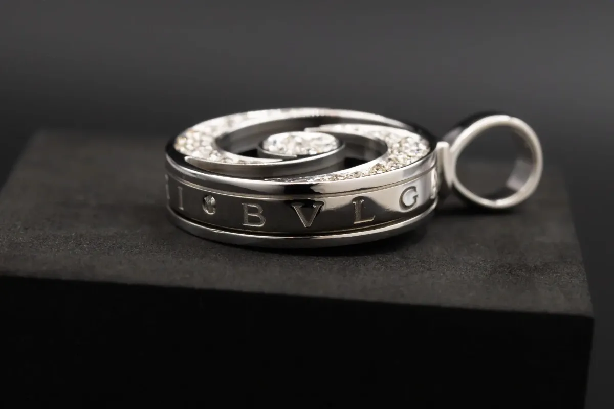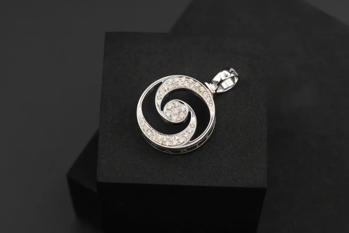 The Bvlgari Optical Illusion Diamond & Onyx Spinning Pendant features a captivating design with a stunning 0.95ct of sparkling diamonds complemented by elegant onyx.