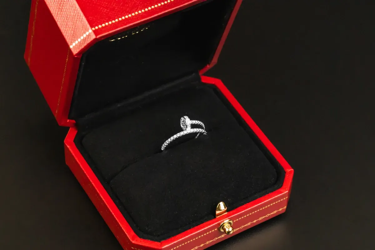 The semi-paved design of the ring gives it a refined yet edgy look, while the "Juste Un Clou" concept, which translates to "Just a Nail," draws inspiration from the simplicity and strength of everyday objects. Sized at 49, this ring perfectly balances sophistication with the avant-garde spirit Cartier is renowned for, making it a timeless addition to any jewellery collection.