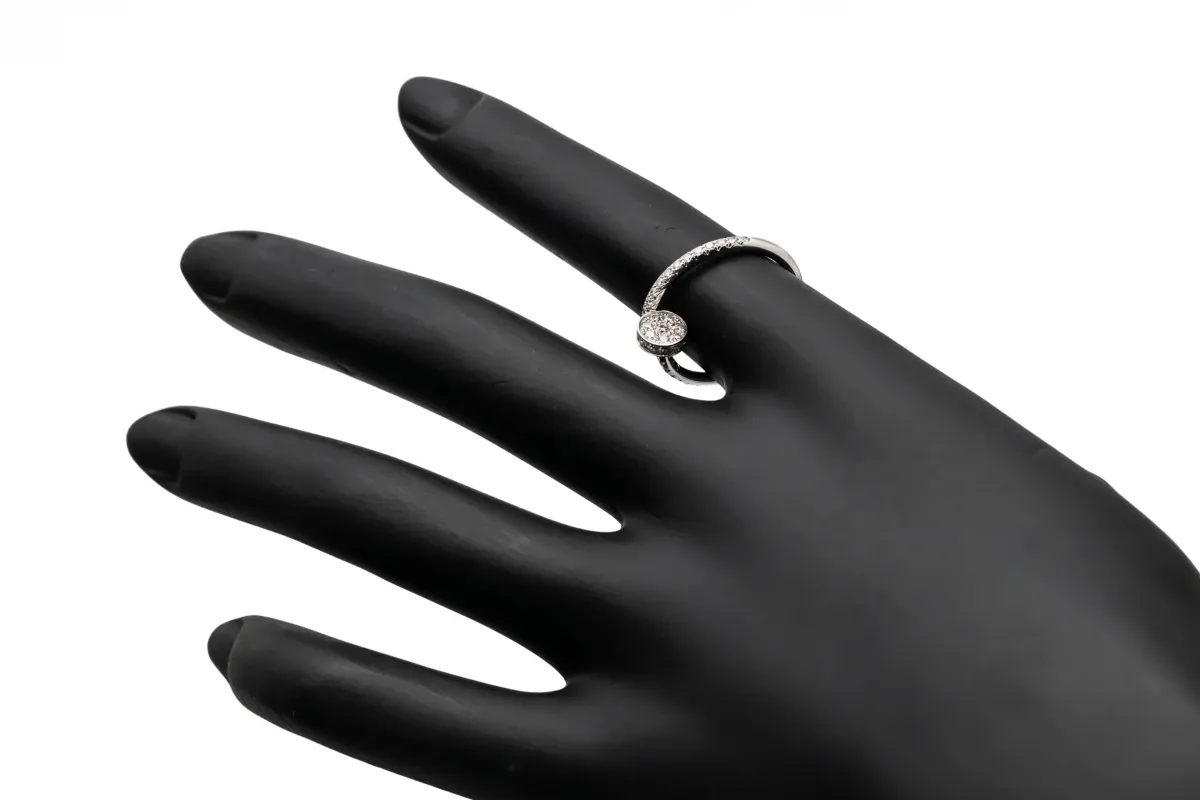 This Cartier 18ct White Gold Juste Un Clou Ring is a striking piece from the iconic Juste Un Clou collection, known for its bold, nail-inspired design. Crafted in 18ct white gold (750/1000), the ring features 53 brilliant-cut diamonds, totaling 0.40 carat, adding a touch of sparkle to its sleek, modern aesthetic.