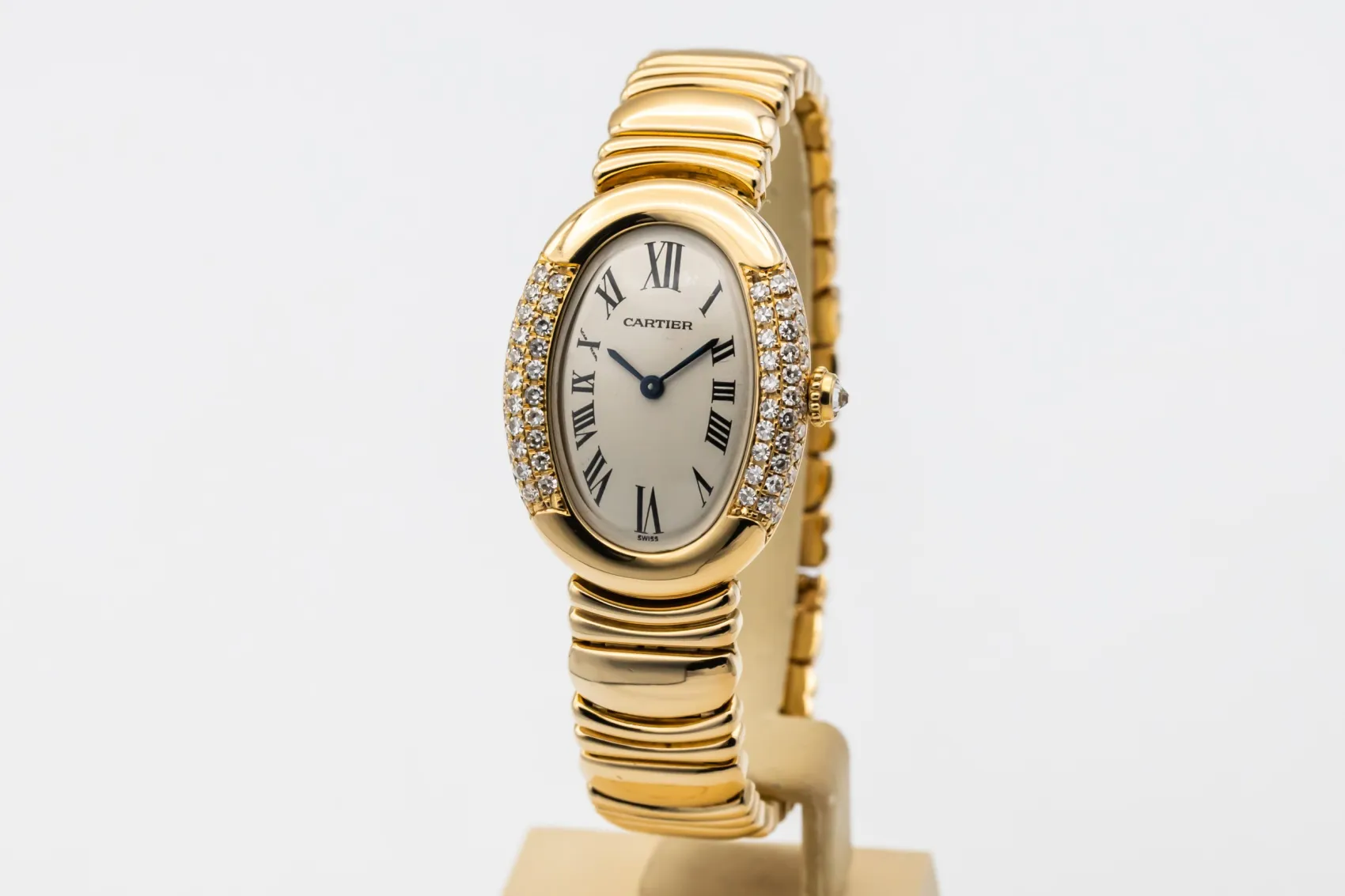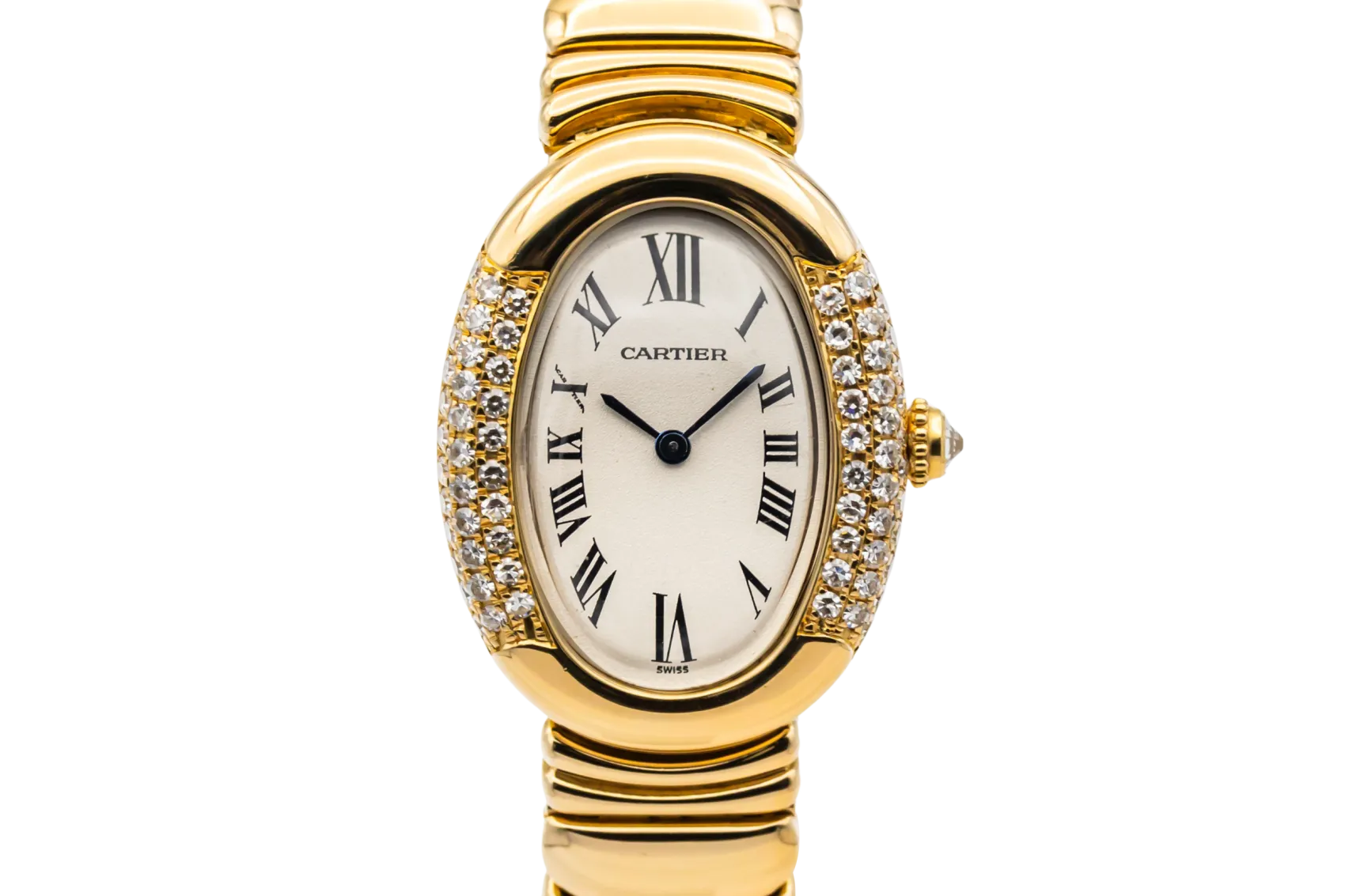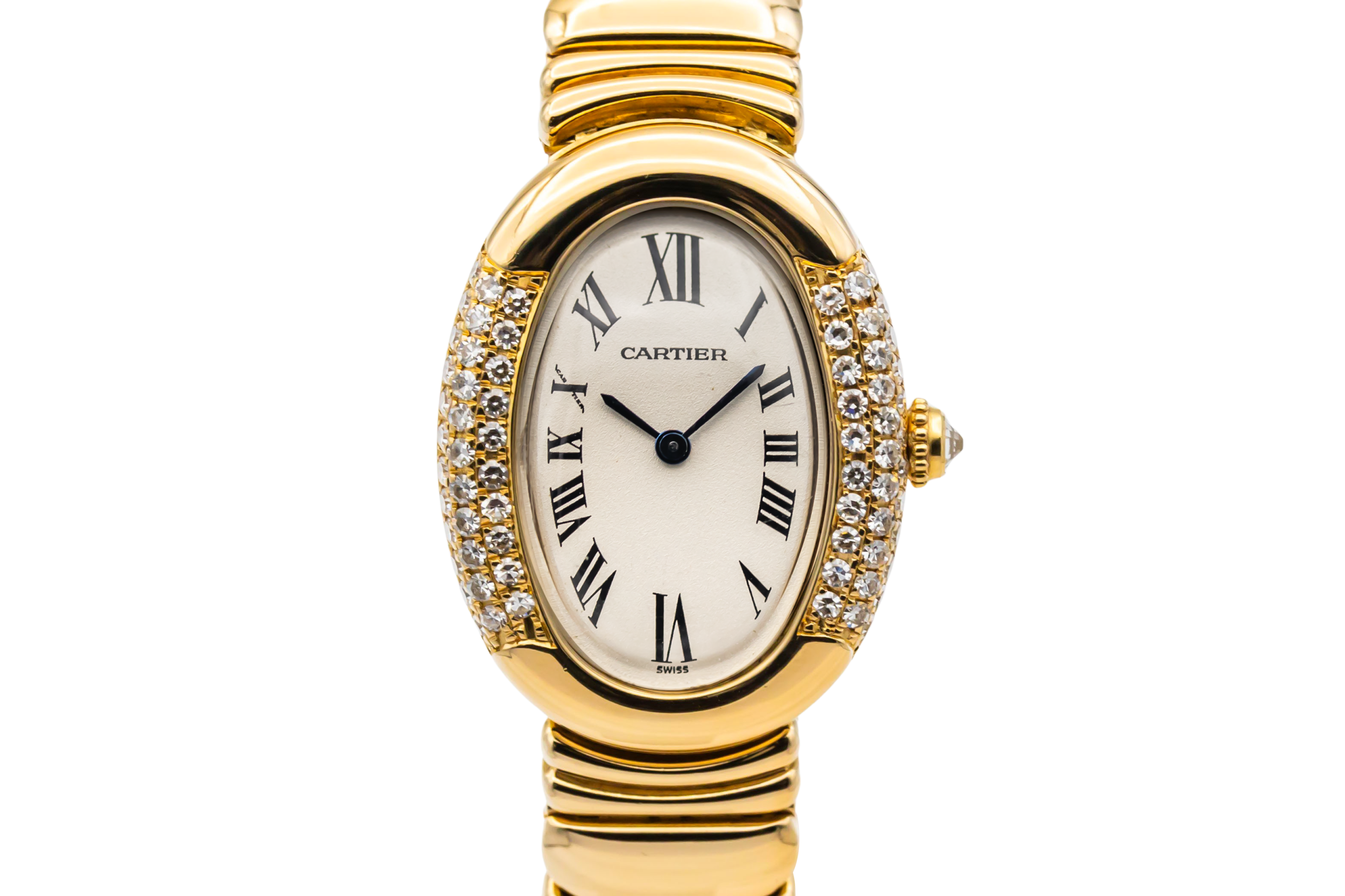 finance this from £218.87 p/m call the shop Read about our Limited Lifetime WarrantyThis Cartier Baignoire Joaillerie watch is an elegant vintage timepiece crafted in 18ct yellow gold. The distinctive oval-shaped case is beautifully set with diamonds along the sides, framing a classic silver dial with black Roman numeral hour markers and blued steel hands. Finished with the iconic yellow gold bracelet that follows the curved profile of the case.