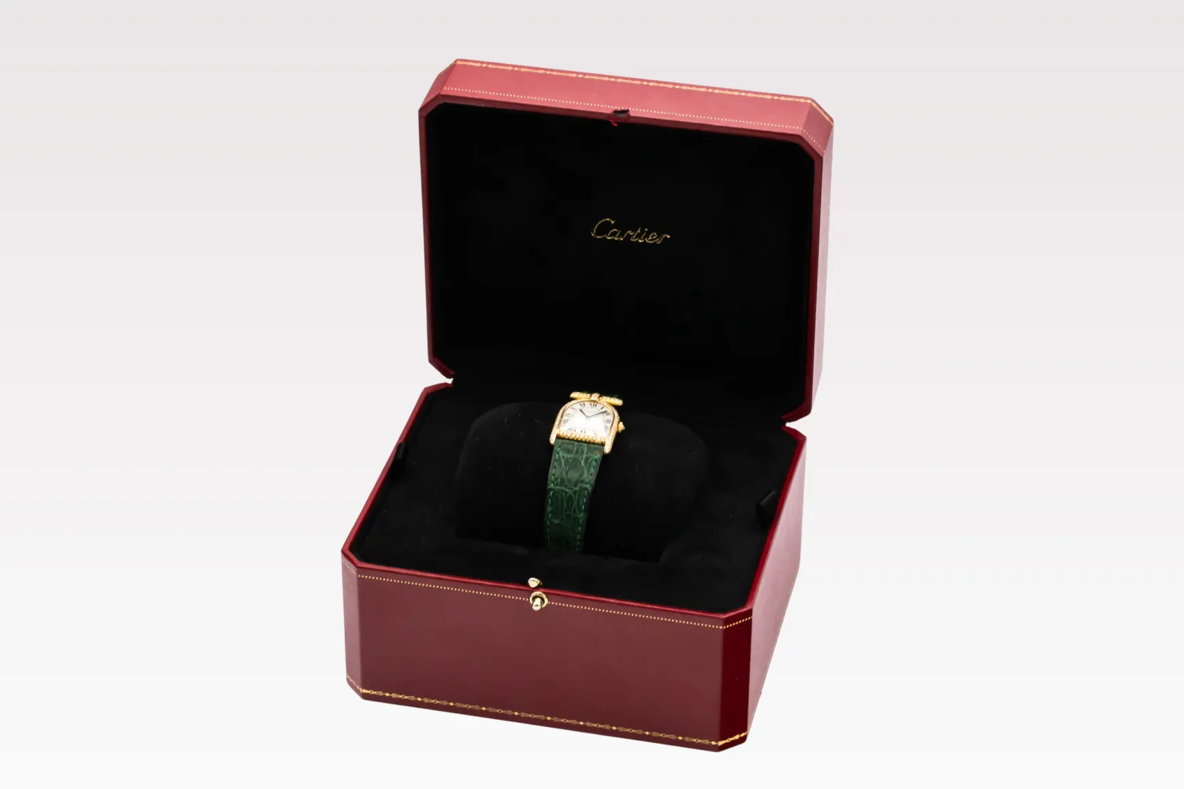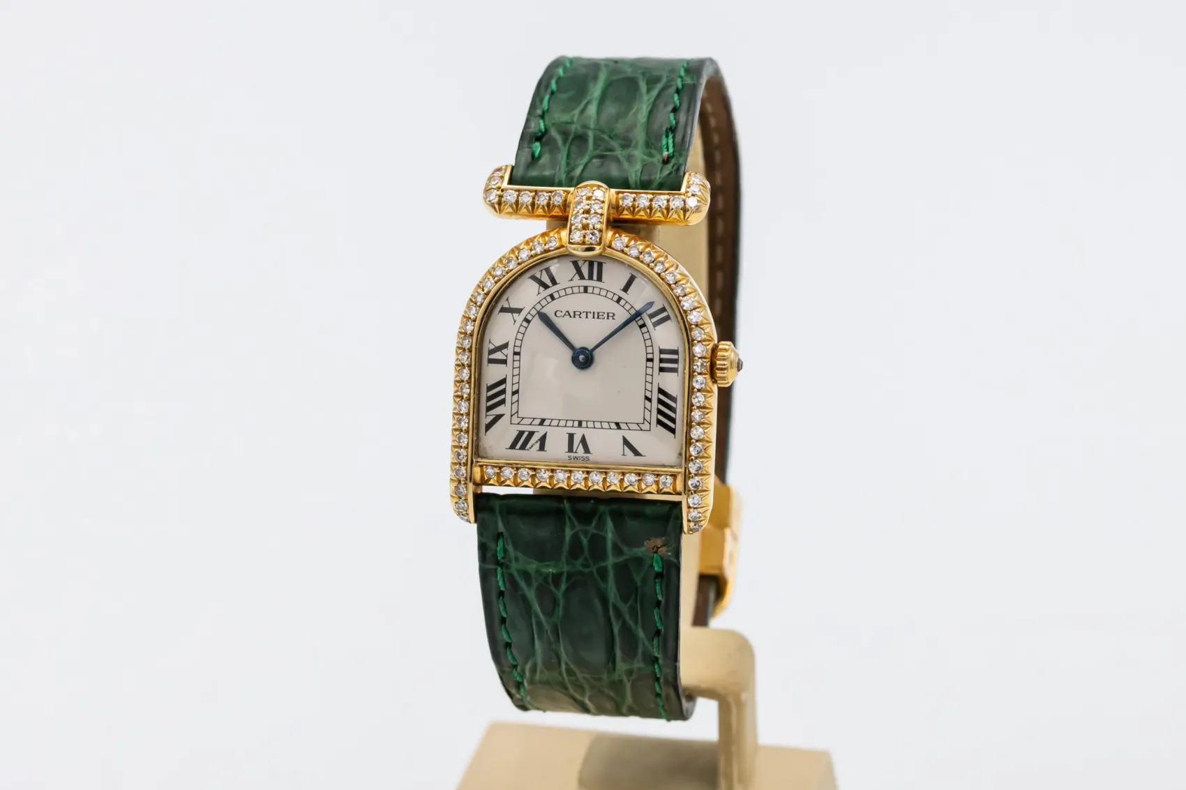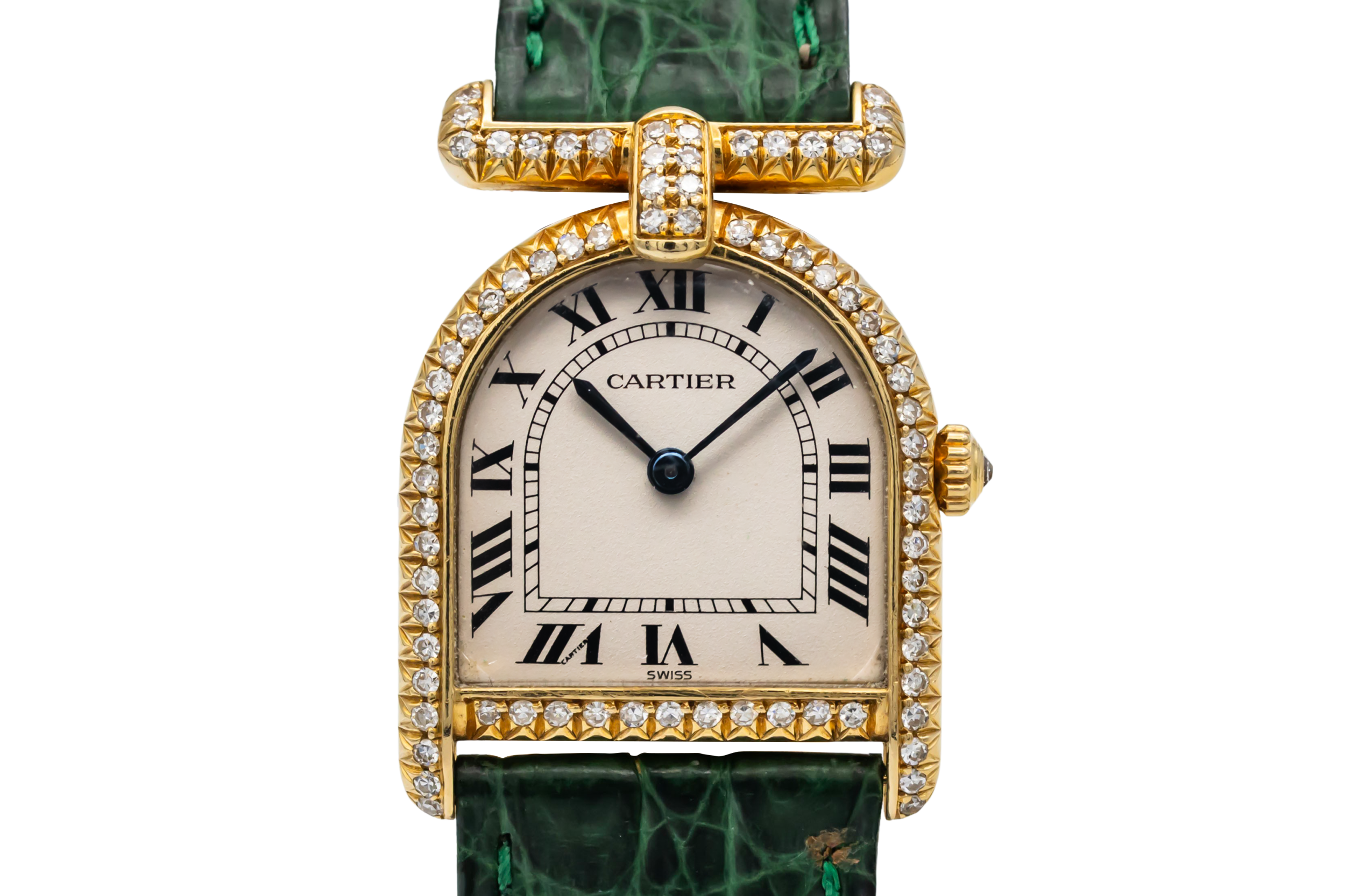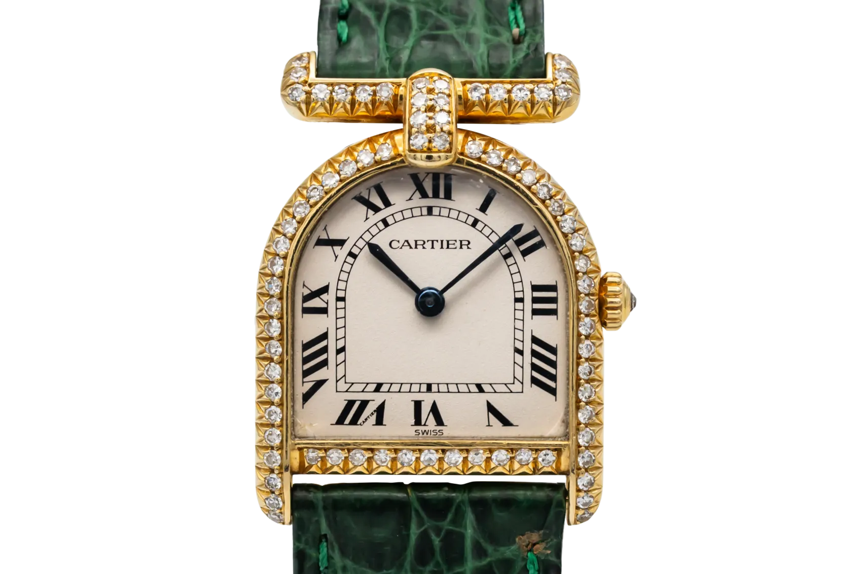 finance this from £155.61 p/m call the shop Read about our Limited Lifetime WarrantyThis circa 1980s Cartier Calandre 22mm is an elegant vintage timepiece crafted in yellow gold, featuring a silvered dial with black Roman numerals and blued steel hands. The case is beautifully set with diamonds and paired with a green leather strap.