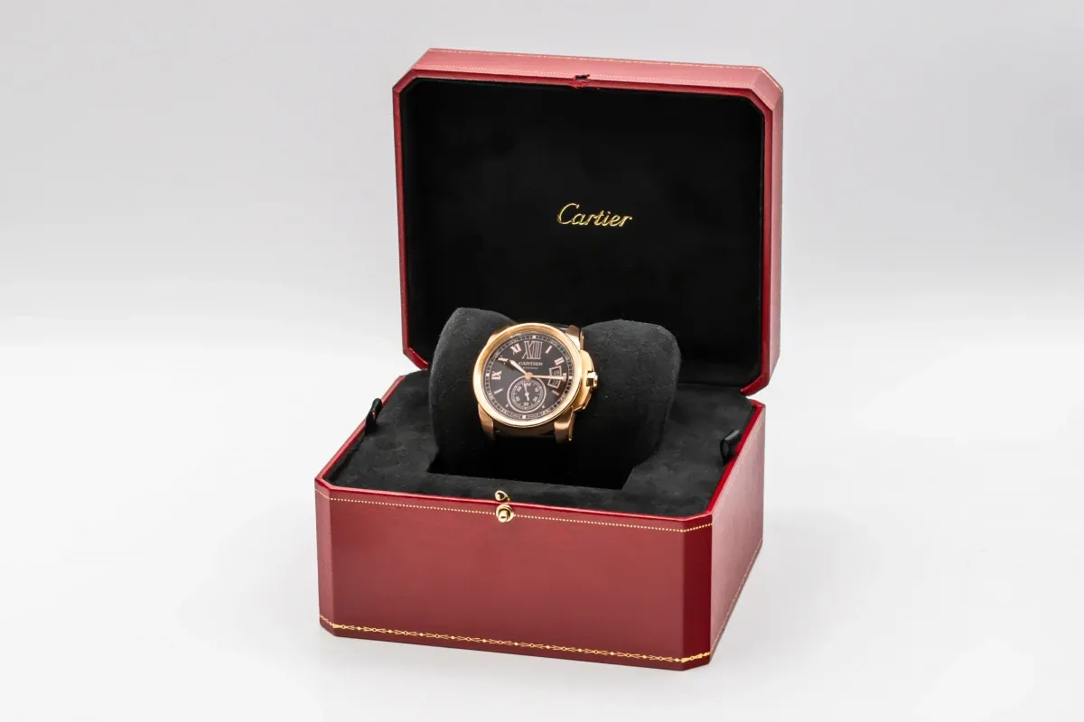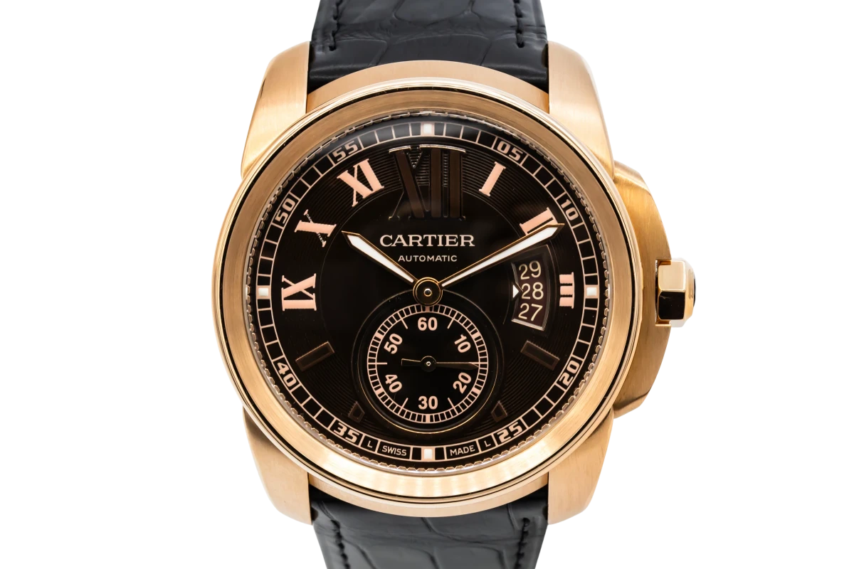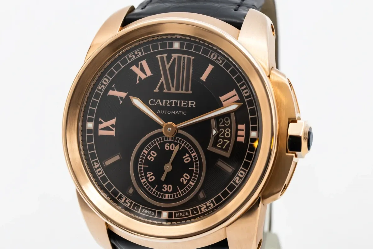 This circa 2010 Cartier Calibre de Cartier features a 42mm 18ct rose gold case paired with a sophisticated black leather strap, creating a bold yet elegant presence on the wrist. The dial is chocolate with prominent Roman numeral hour markers and sword-shaped hands, complemented by a date window at 3 o’clock. Its polished smooth bezel and large, masculine proportions combine modern design with Cartier’s timeless aesthetic, making it suitable for both formal and everyday wear.