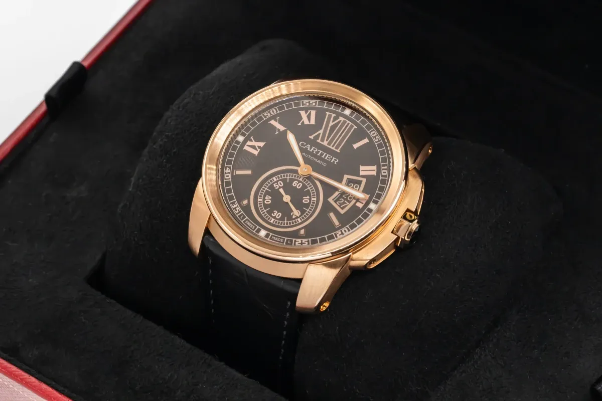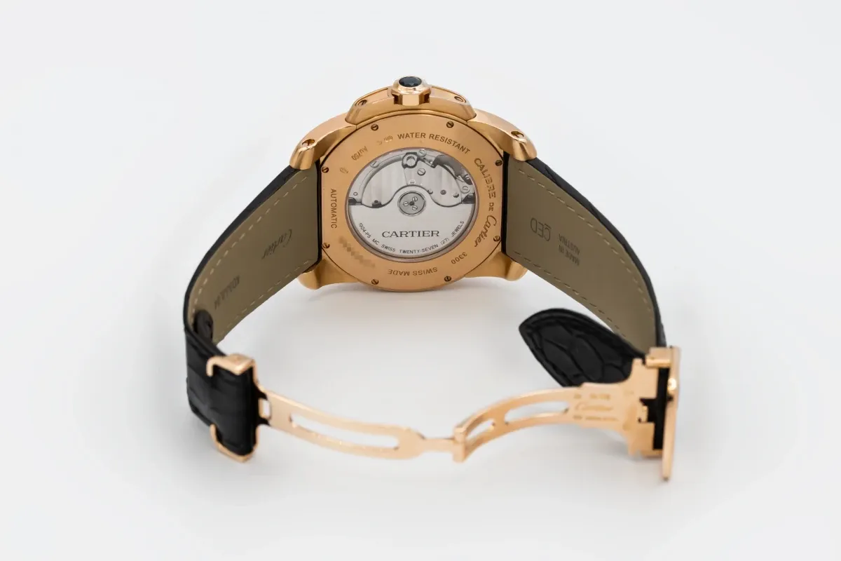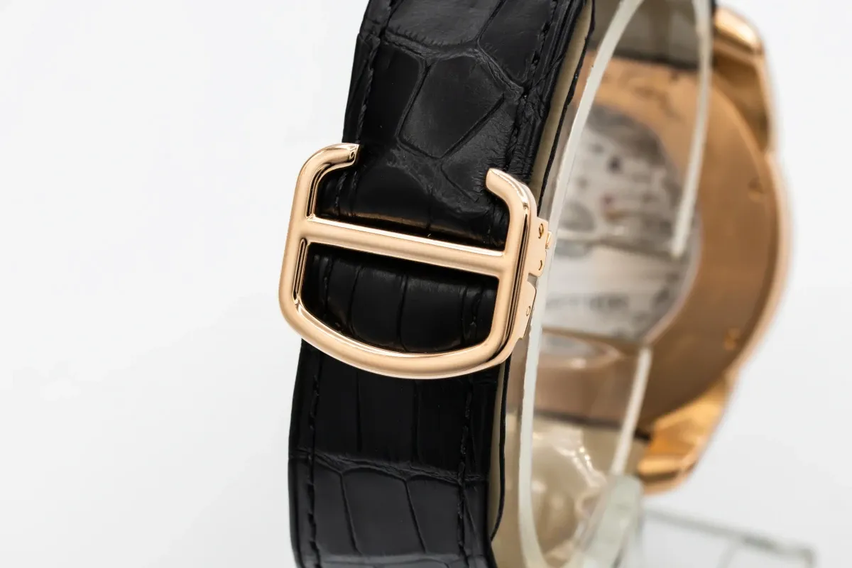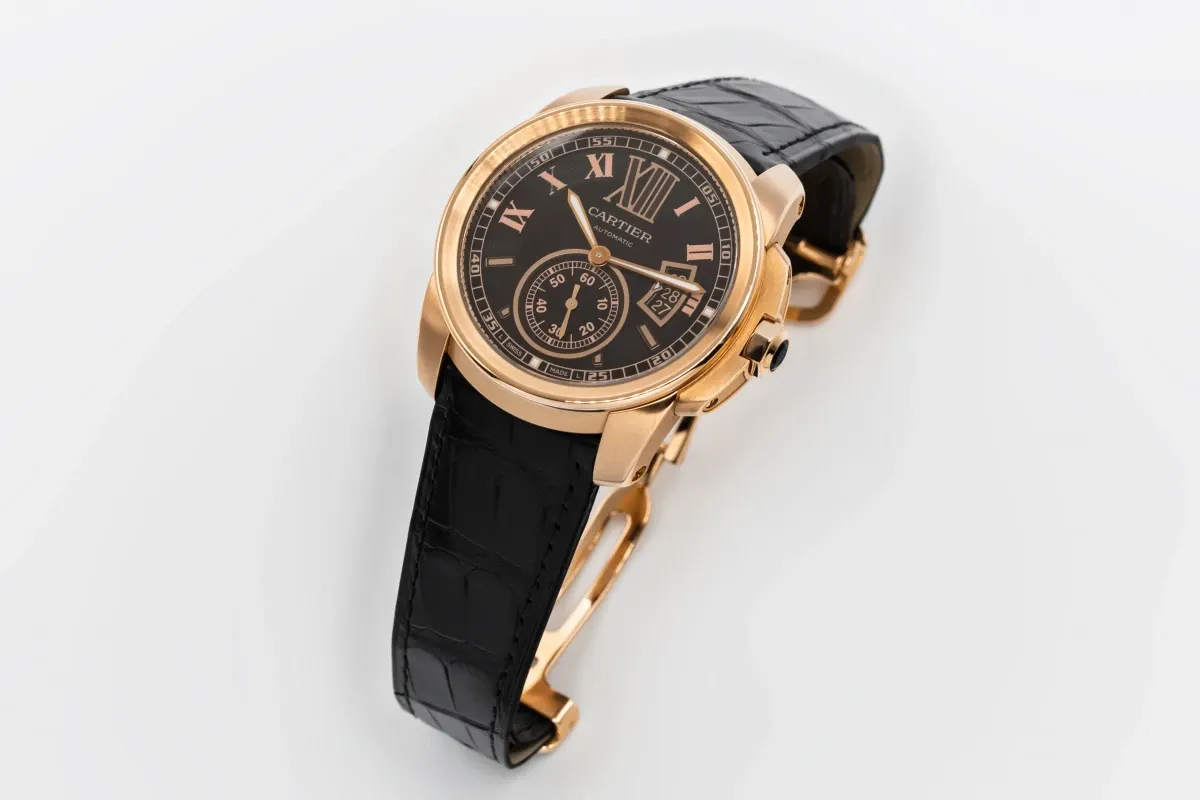 This circa 2010 Cartier Calibre de Cartier features a 42mm 18ct rose gold case paired with a sophisticated black leather strap, creating a bold yet elegant presence on the wrist. The dial is chocolate with prominent Roman numeral hour markers and sword-shaped hands, complemented by a date window at 3 o’clock. Its polished smooth bezel and large, masculine proportions combine modern design with Cartier’s timeless aesthetic, making it suitable for both formal and everyday wear.